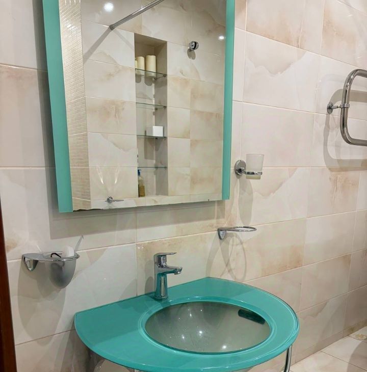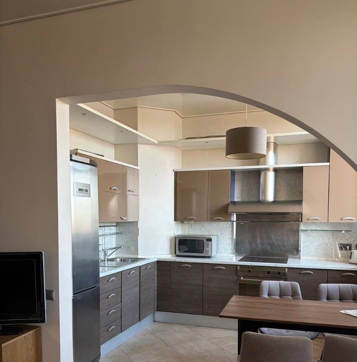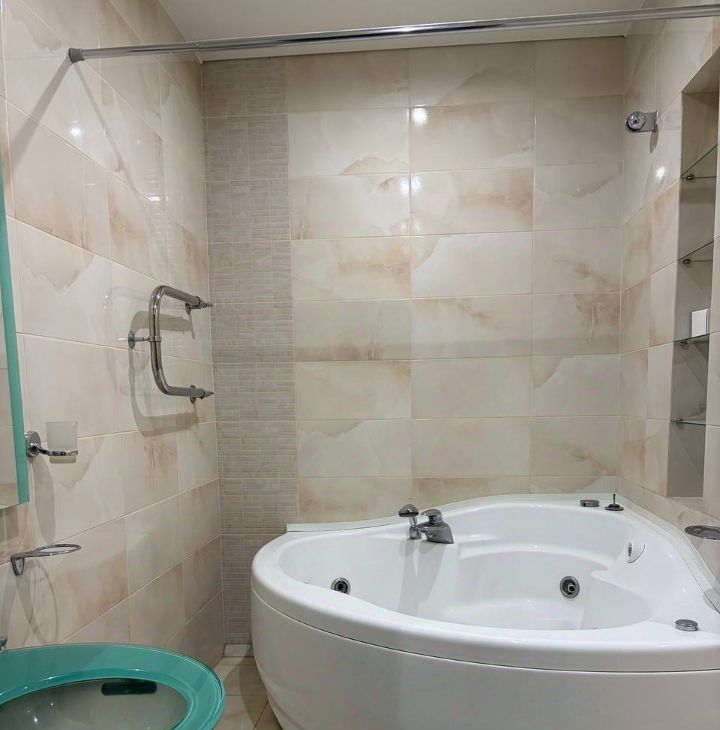 Зал соединен с кухней, есть эркер. Есть вся необходимая мебель и бытовая техника. Кондиционер. Микроволновая печь. Посудомоечная машина. Небольшой коридор, с шкафом для верхней одежды, небольшая полка для хранения обуви, небольшая спальня с вместительным шкафом. Большая ванная комната с джакузи соединена с туалетом.