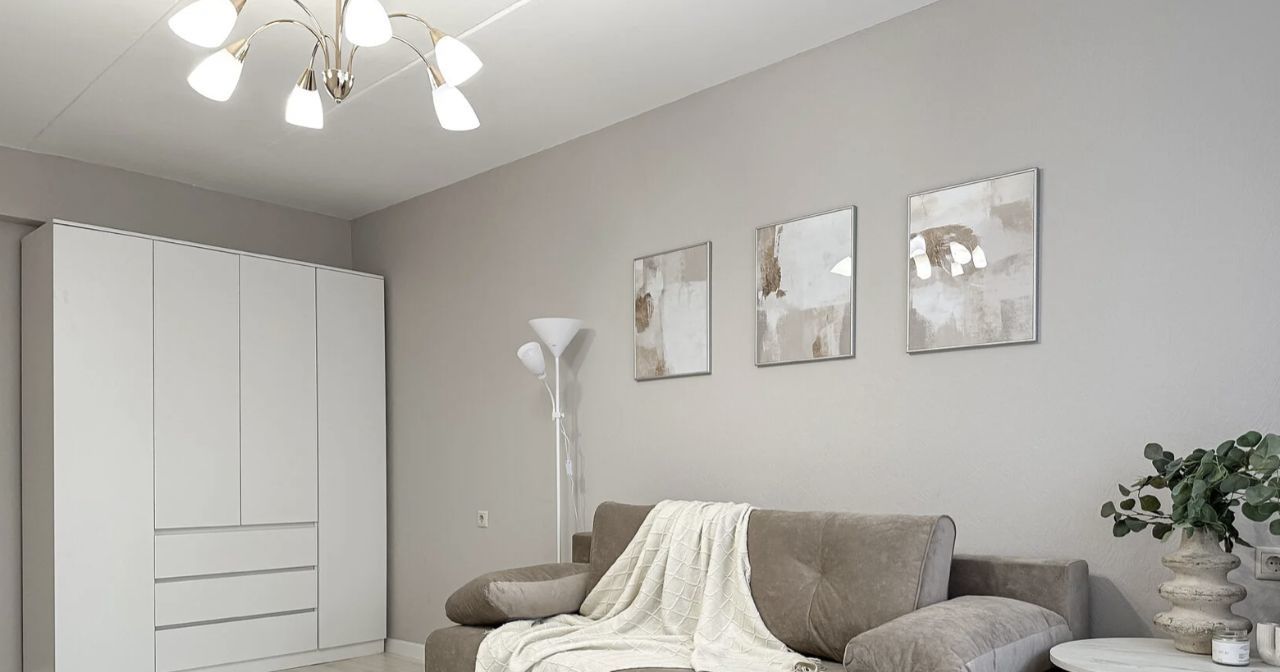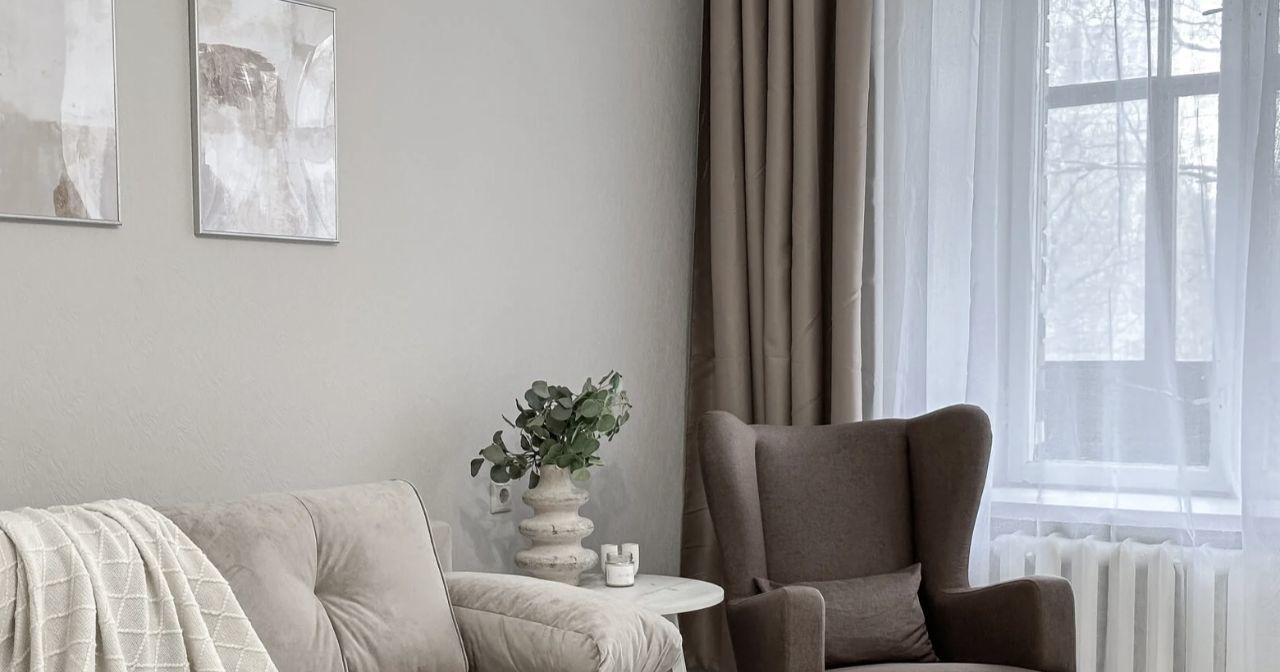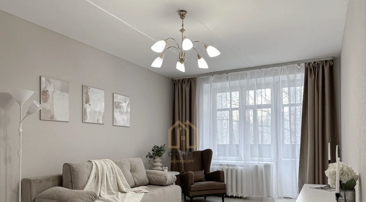 — просторную гостиную с диваном, креслом и стильным торшером — идеальное место для отдыха;