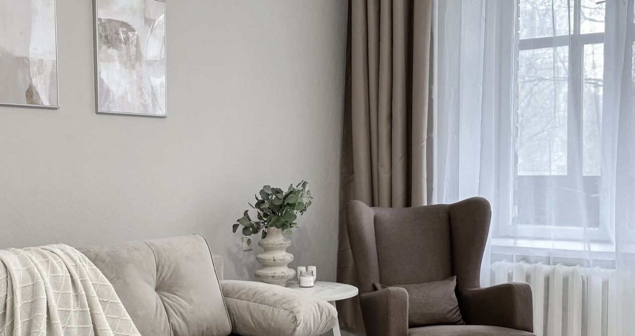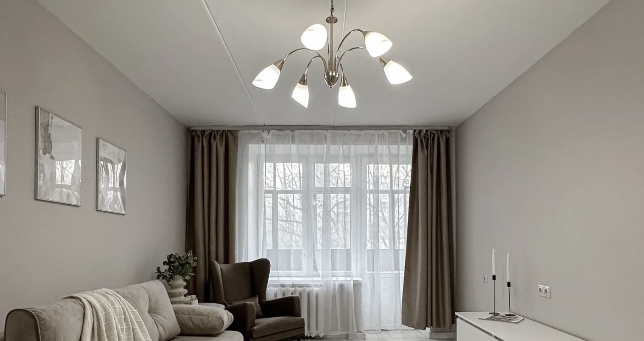 — просторную гостиную с диваном, креслом и стильным торшером — идеальное место для отдыха;