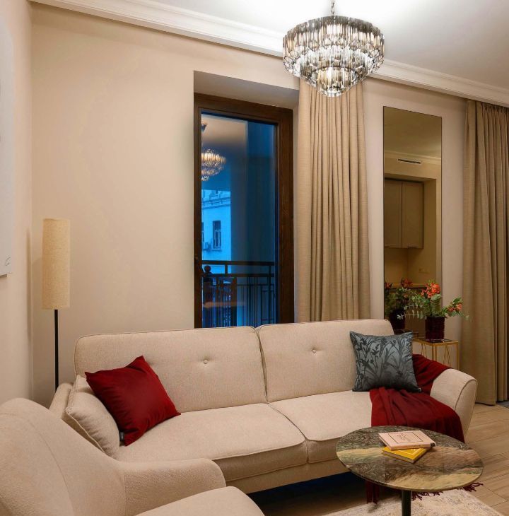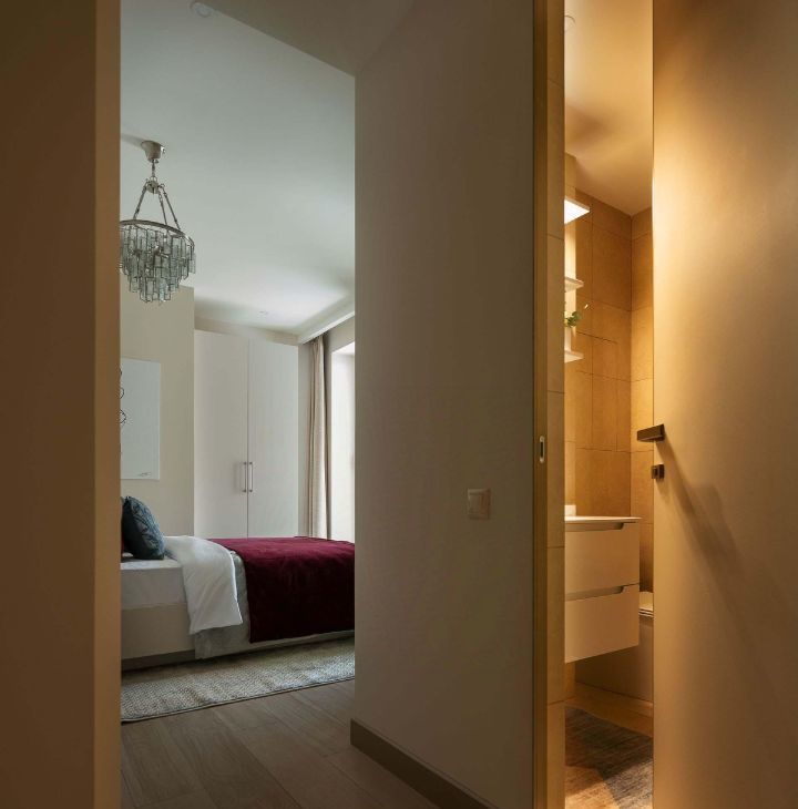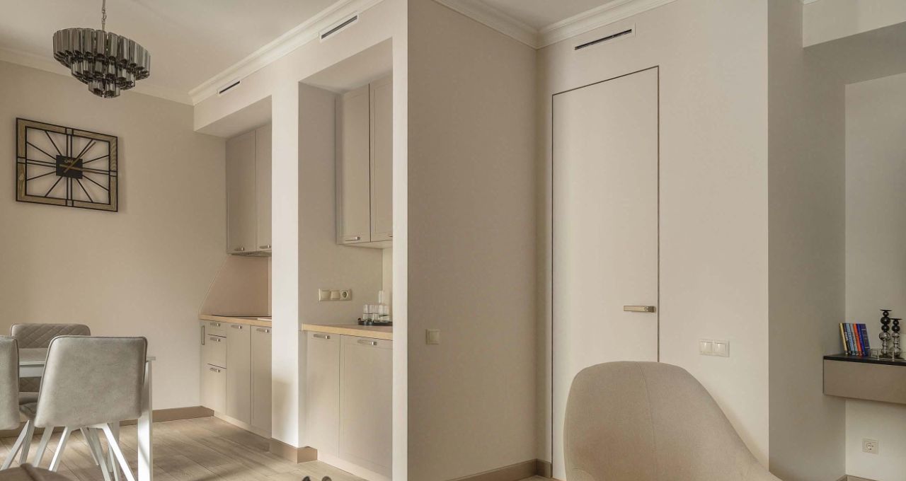 Внутри апартамента все спланировано функционально, удобно и практично. И при этом Вы уже не будете тратить время и свою энергию на стояние в пробках, так как локация дома позволяет добраться до любого места центра максимум за 15 минут (на машине/пешком) и также быстро вернуться обратно. Гостиная совмещена с зоной кухни (из них же есть доступ на террасу).