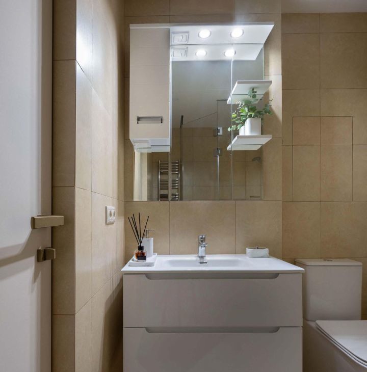 Техника: холодильник (небольшой) с морозильной камерой, отдельный холодильник для бутылок, электроплита с защитой от перегрева, посудомоечная машина, стиральная машина с сушкой, телевизор (65 диагональ) с подключением к интернету.