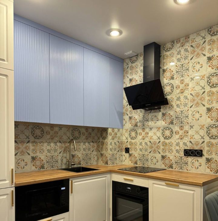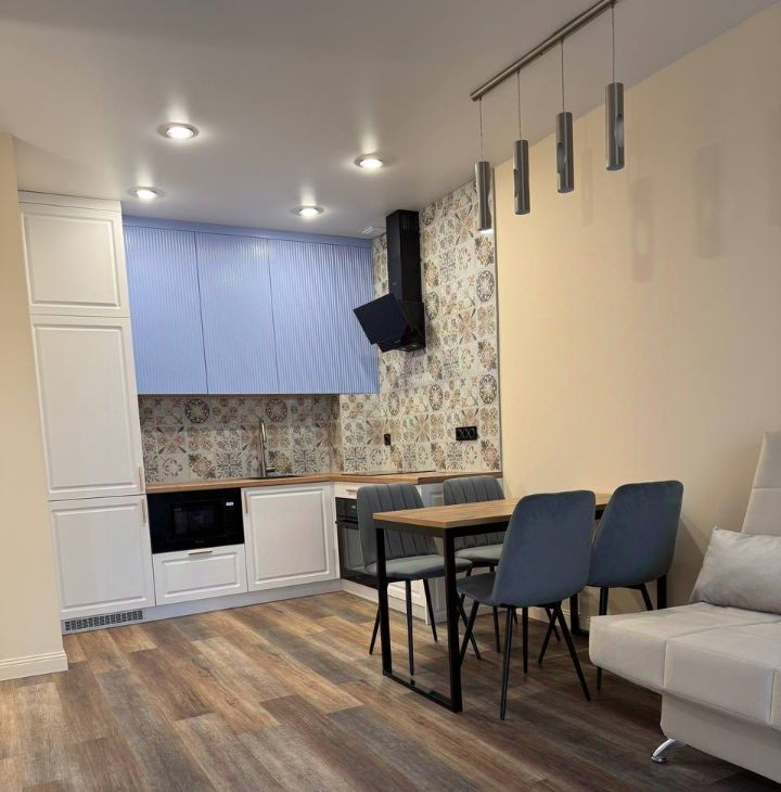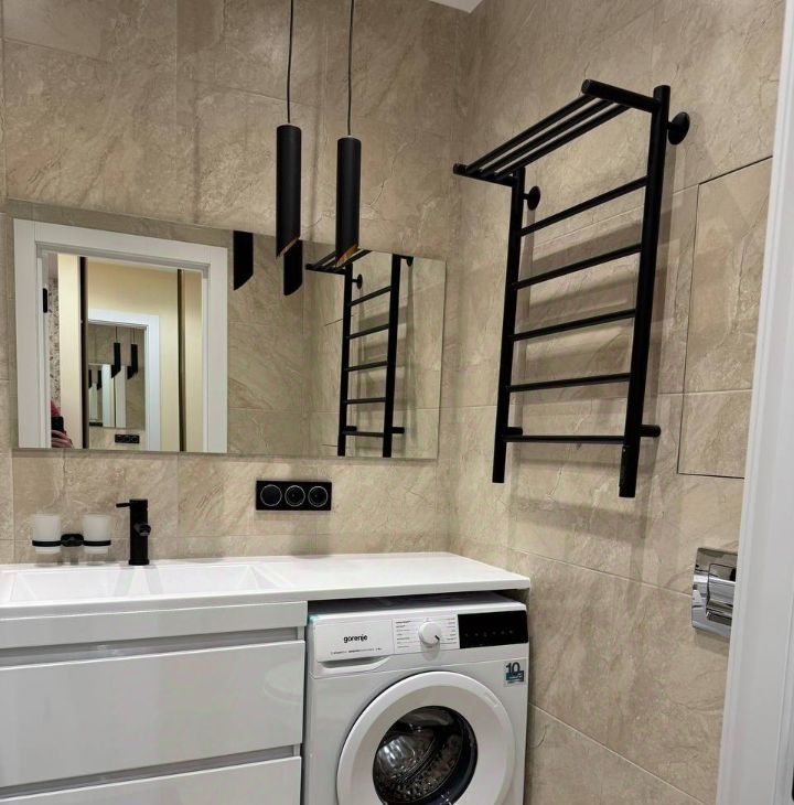 Бытовая техника: холодильник, варочная поверхность, духовой шкаф, вытяжка, микроволновка, телевизор, полотенцесушитель, стиральная машина, кондиционер.