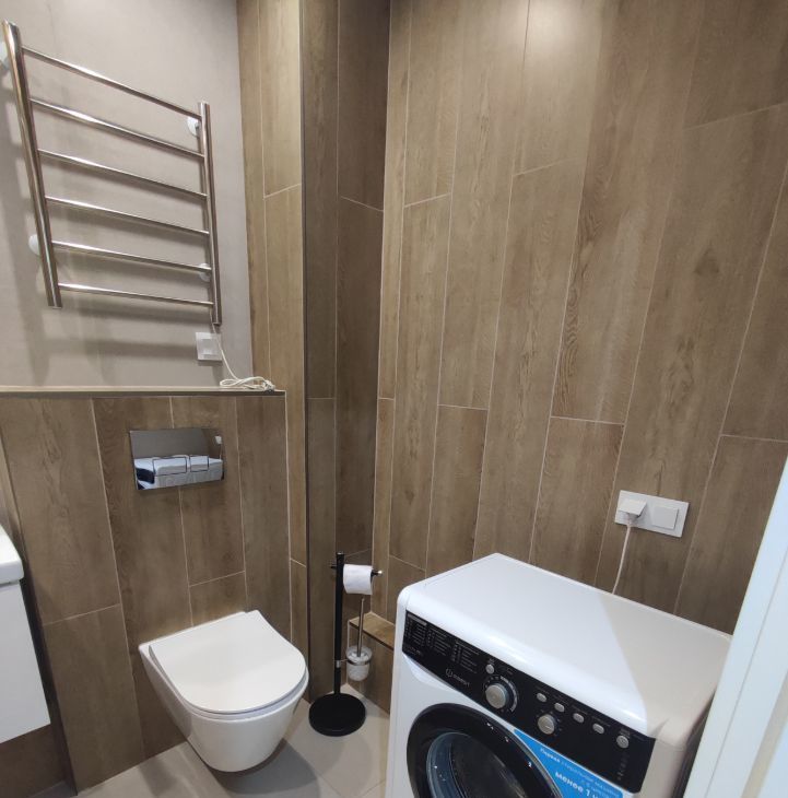 В коридоре шкаф для одежды. Сан. узел. совмещённый, стиральная машина.