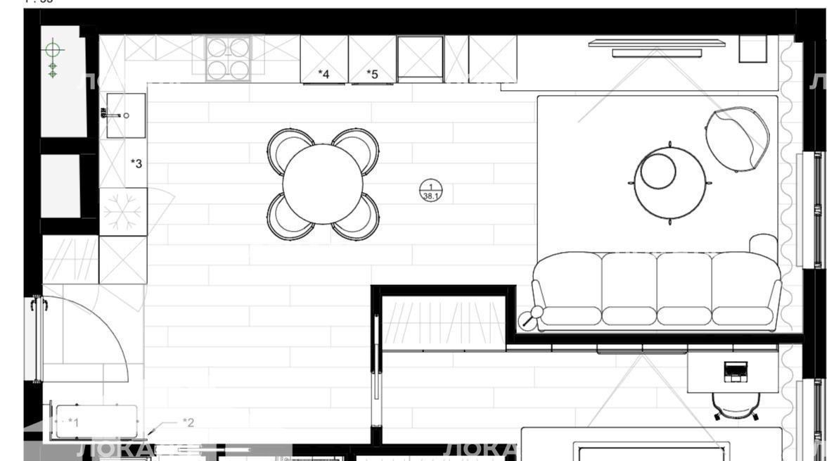 -Просторная кухня с объединённой гостиной, где находится большой и удобный диван