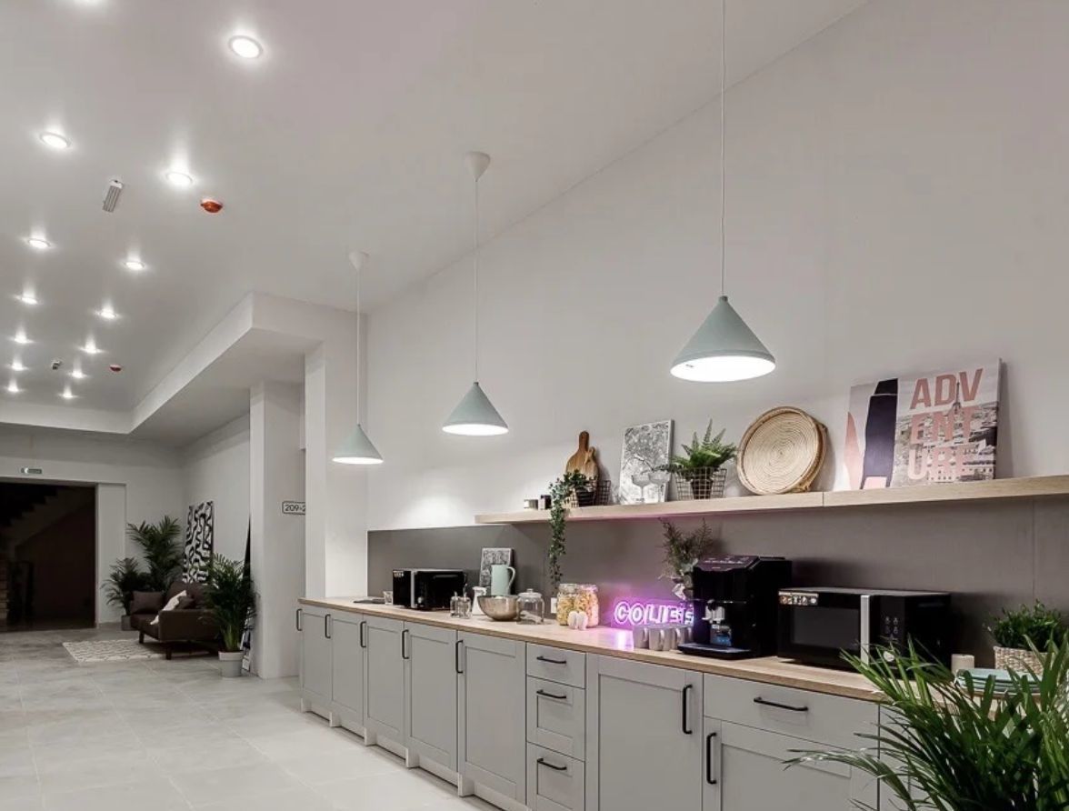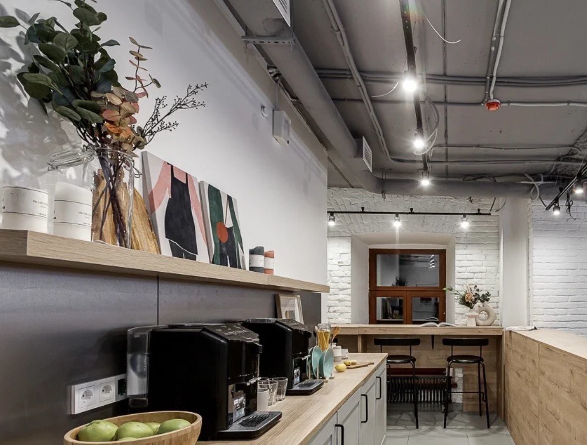 — буфет на 2 этаже с кофемашиной, микроволновкой и кухонным гарнитуром;