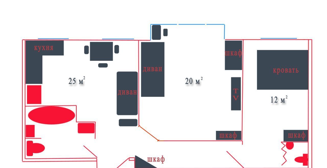 Кухня-гостинная 25 кв. м. + 2 изолированных комнаты.