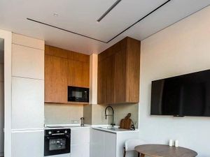 Кухня площадью 20 м выполнена в современном стиле с качественной отделкой и оснащена всей необходимой техникой. В квартире совмещенный санузел с качественной сантехникой.