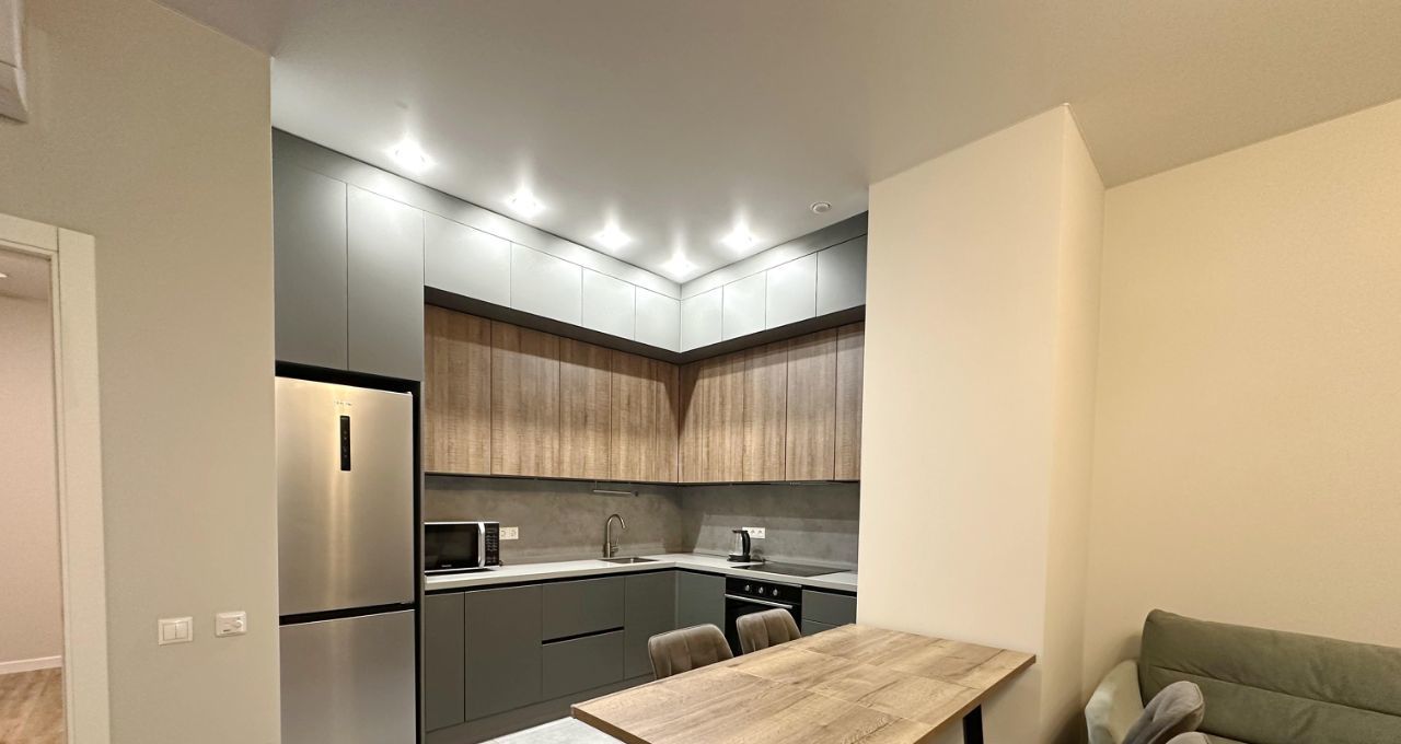 Квартира полностью укомплектована современной мебелью, в наличии вся встроенная бытовая техника, кондиционер, стиральная машина от ведущих иностранных производителей.