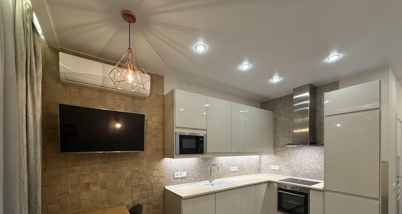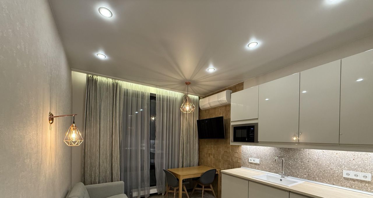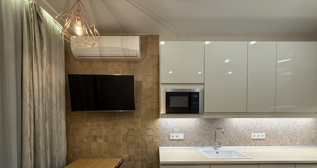 Апартаменты выполнены в стиле "евроремонт" и полностью готовы к комфортному проживанию. В наличии вся необходимая мебель на кухне и в комнате. Техника представлена кондиционером, холодильником, посудомоечной машиной, телевизором и стиральной машиной. Ванная комната оборудована ванной. Окна выходят на улицу, поэтому в квартире всегда светло и уютно.