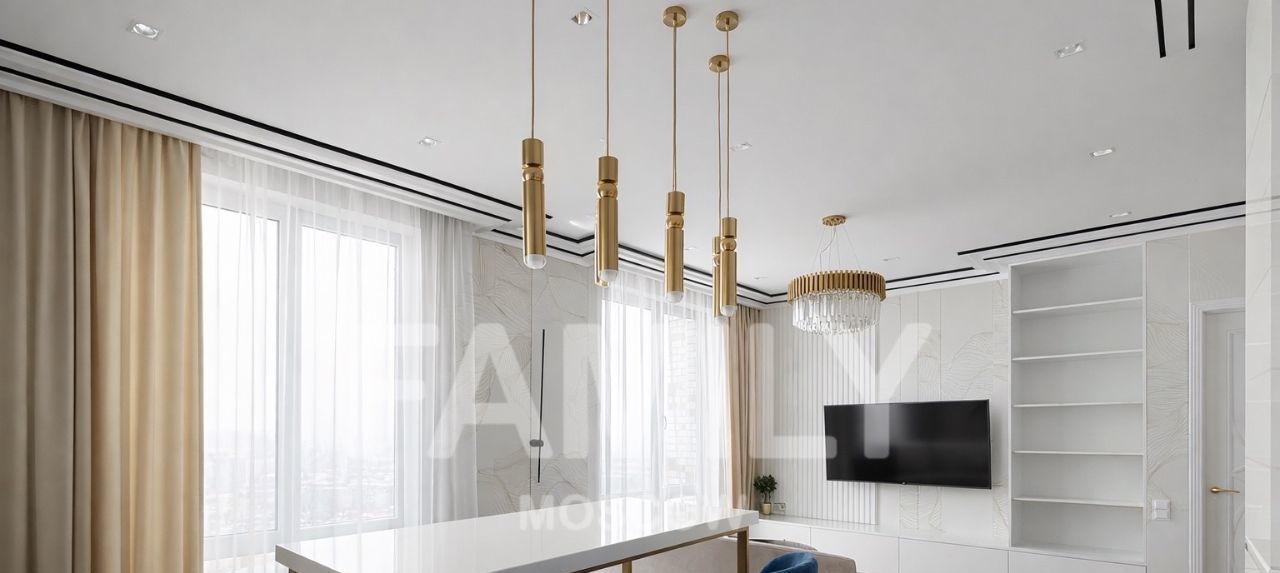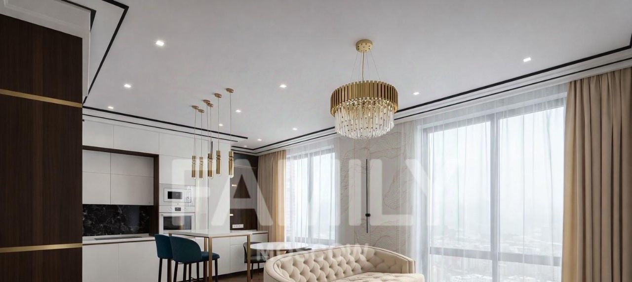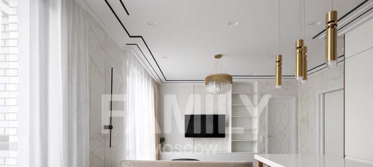 | Светлая кухнягостиная для приёма гостей и работы из дома, отдельная спальня, гардеробная, совмещённый санузел с ванной и душевой.