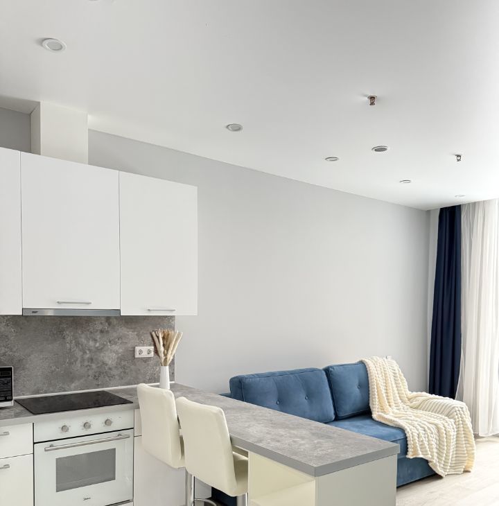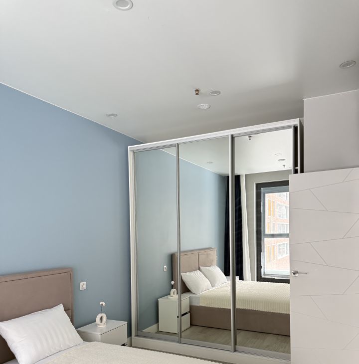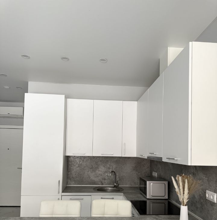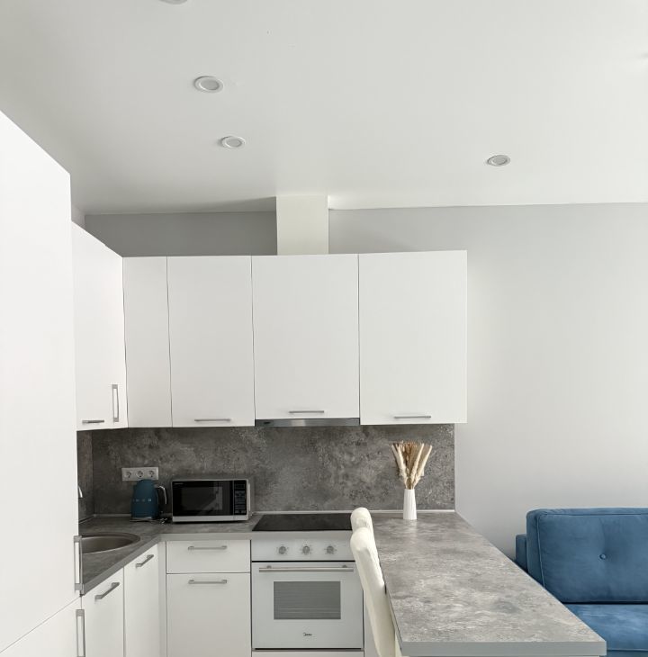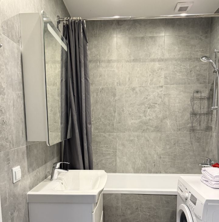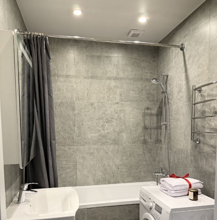 В квартире сделан современный евроремонт, что приятно порадует каждого арендатора. Есть всё необходимое как в жилой зоне, так и на кухне. Для вашего удобства установлена современная техника: встроенная кухня с функциональной бытовой техникой (холодильник, варочная панель и духовой шкаф, посудомоечная машина), 2 кондиционера, телевизор и стиральная машина. Также дополнительно в квартире находятся микроволновая печь, чайник, пылесос, утюг. Санузел совмещённый с комфортной ванной, раковиной и зеркалом с подсветкой.