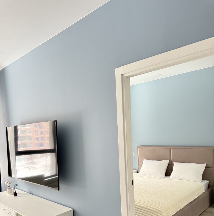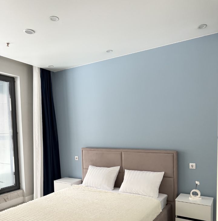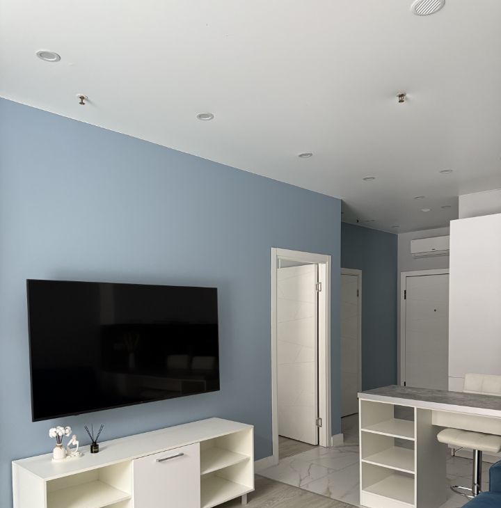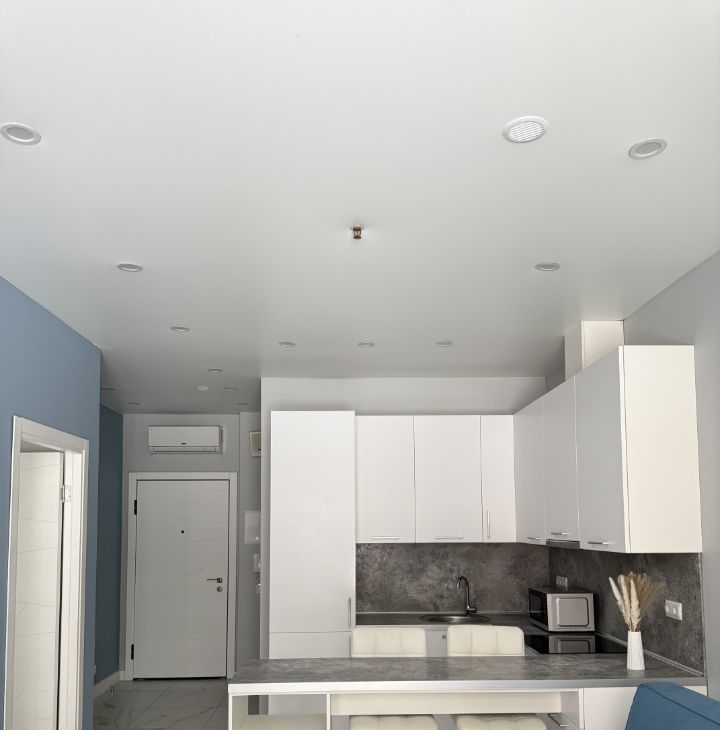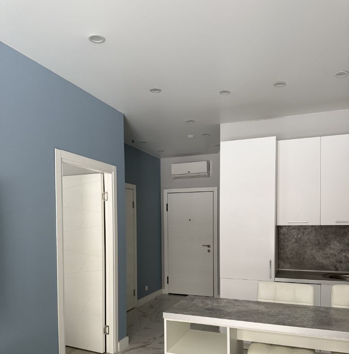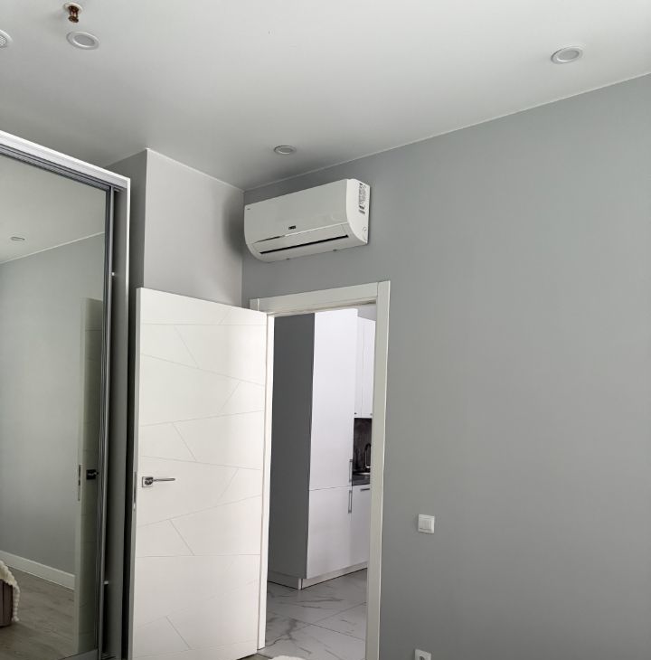 В квартире сделан современный евроремонт, что приятно порадует каждого арендатора. Есть всё необходимое как в жилой зоне, так и на кухне. Для вашего удобства установлена современная техника: встроенная кухня с функциональной бытовой техникой (холодильник, варочная панель и духовой шкаф, посудомоечная машина), 2 кондиционера, телевизор и стиральная машина. Также дополнительно в квартире находятся микроволновая печь, чайник, пылесос, утюг. Санузел совмещённый с комфортной ванной, раковиной и зеркалом с подсветкой.