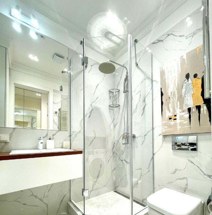 Апартаменты в отличном состоянии, рационально использовано все имеющееся пространство: встроенная кухня и вся бытовая техника, необходимая для проживания , вместительные шкафы для хранения, двуспальная кровать, комфортный большой диван в гостиной; просторный санузел с встроенной душевой кабиной, множество вариантов освещения.