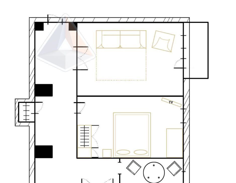 • Две изолированные комнаты: просторная гостиная 20 м² для вдохновляющих встреч и уютная спальня 16 м² — приватный оазис для восстановления сил
