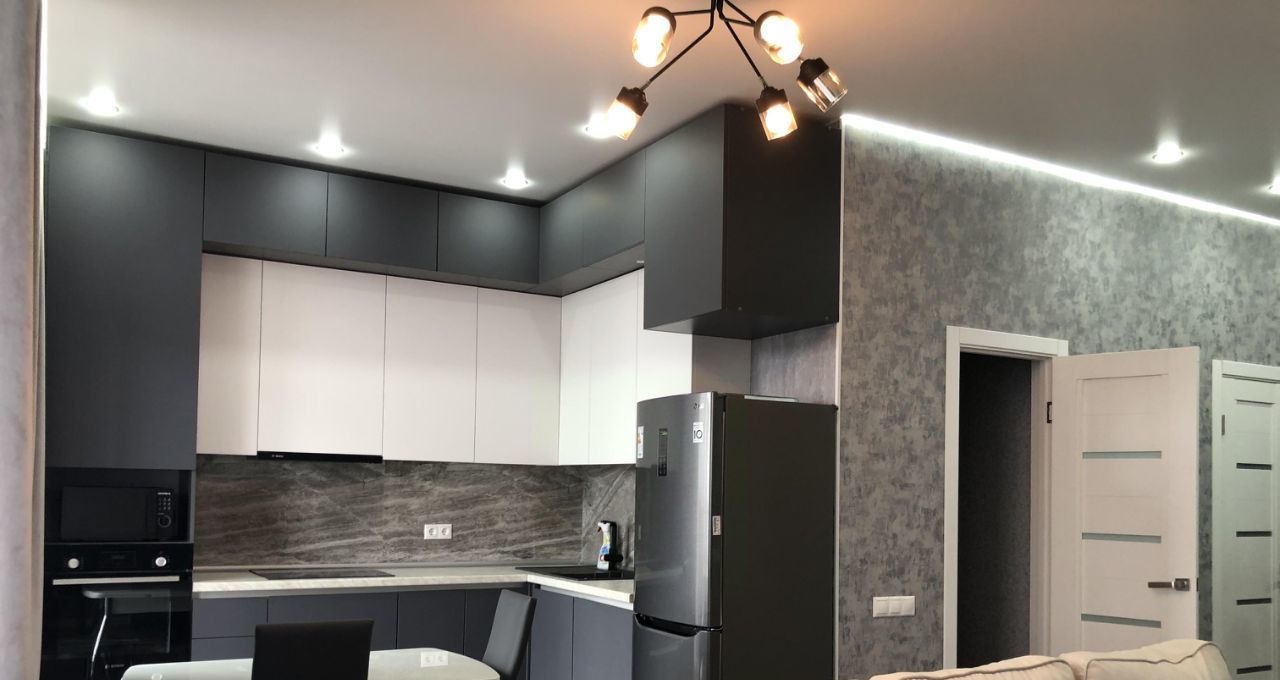 Планировка: Просторная гостиная-студия совмещённая с кухней и небольшая уютная спальня с двухспальной кроватью и тумбочкой. Совмещённый санузел с ванной. Кухонный гарнитур, встроенная бытовая техника: холодильник, духовой шкаф, плита с вытяжкой, (стеклокерамика), стиральная машина, посудомоечная машина, большой раскладной диван, стойка с ТВ. Небольшая гардеробная комната с наполнением.