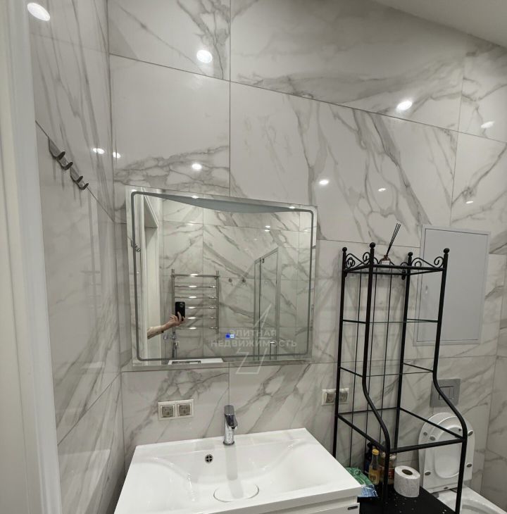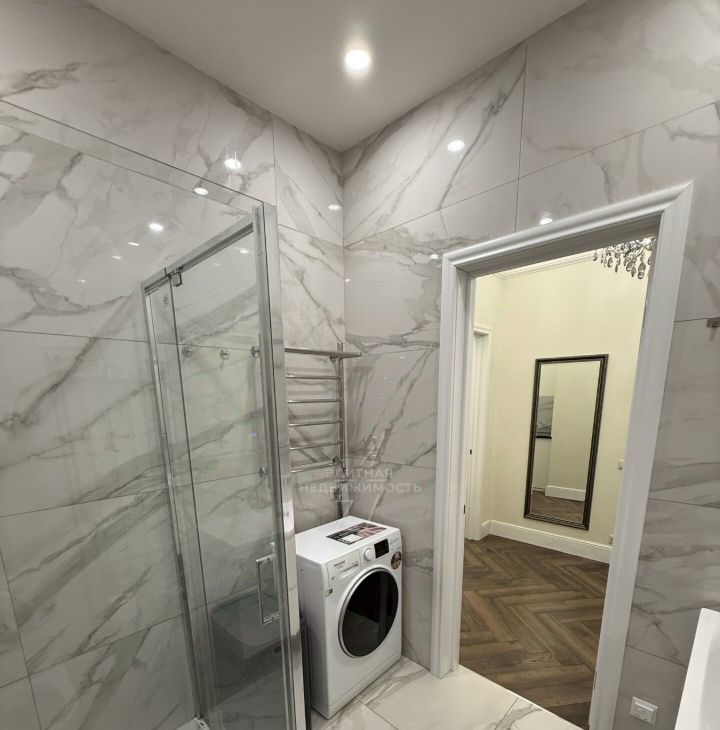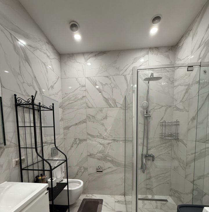 Санузел выполнен в современном стиле: душевая кабина, качественная сантехника, продуманное хранение.