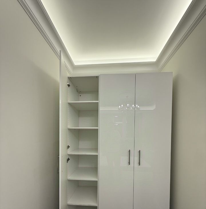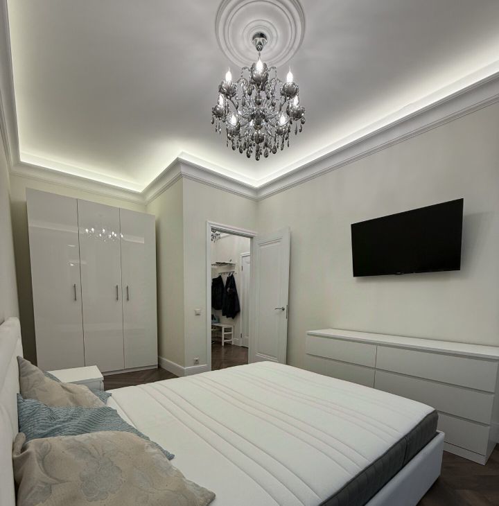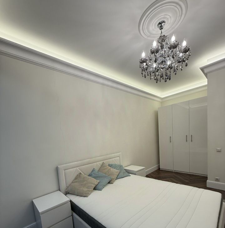 высокие потолки с декоративной лепниной и многоуровневым освещением