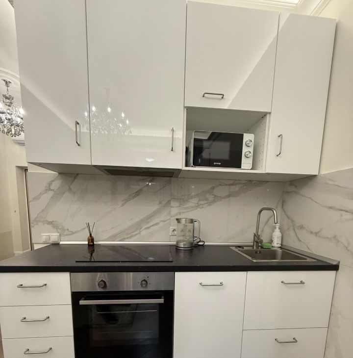 кухня со встроенной техникой (духовой шкаф, варочная панель, микроволновая печь, холодильник)