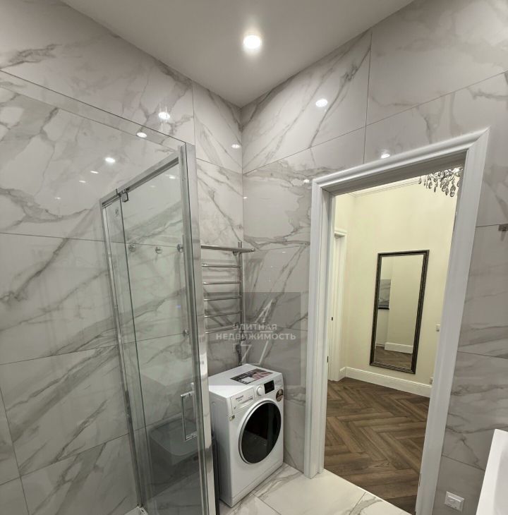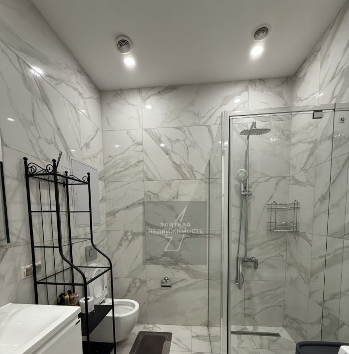 Санузел выполнен в современном стиле: душевая кабина, качественная сантехника, продуманное хранение.