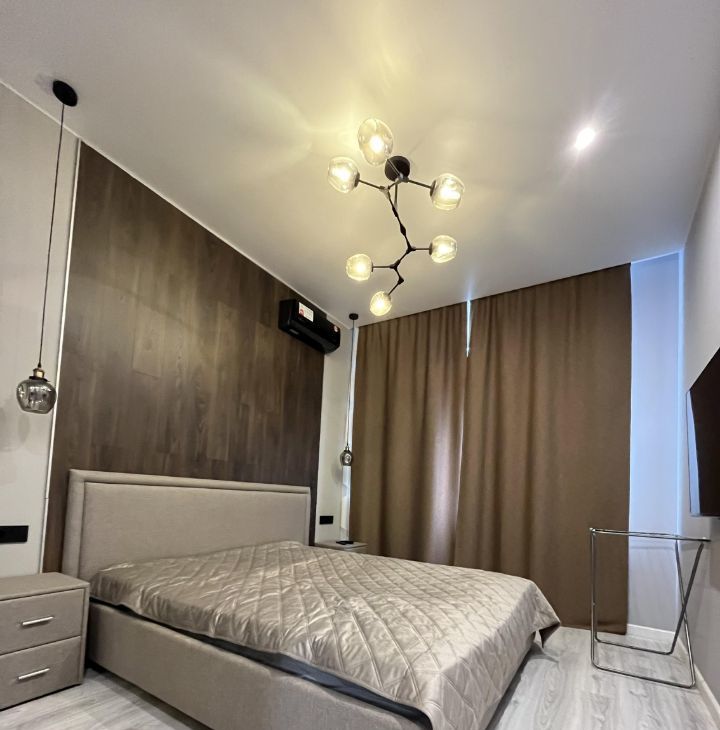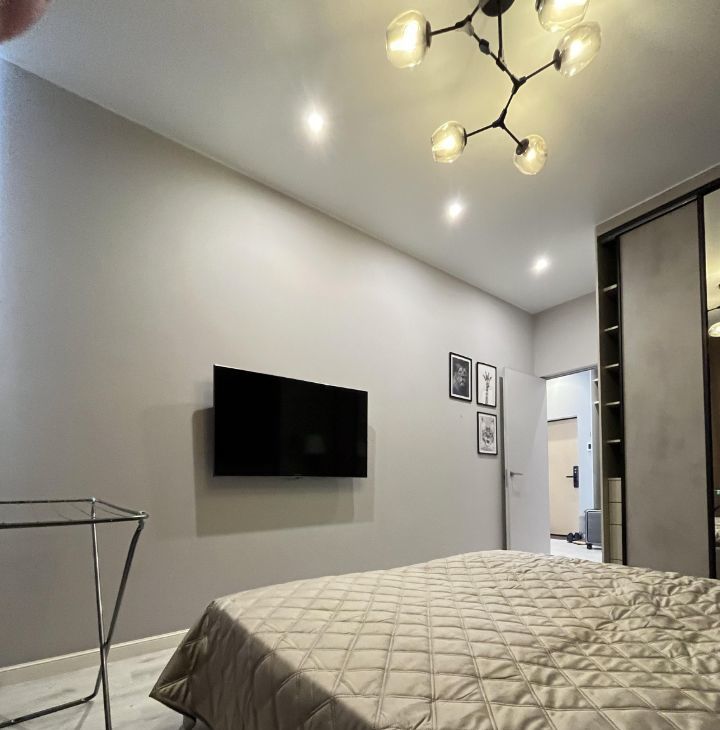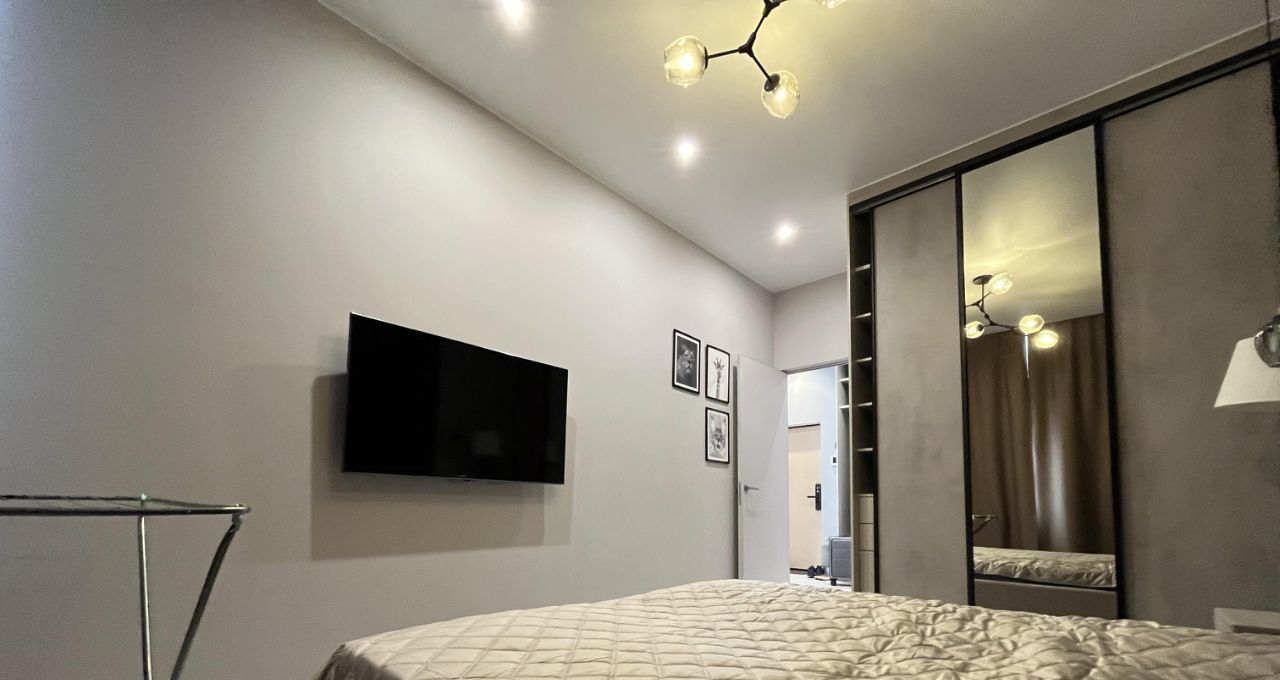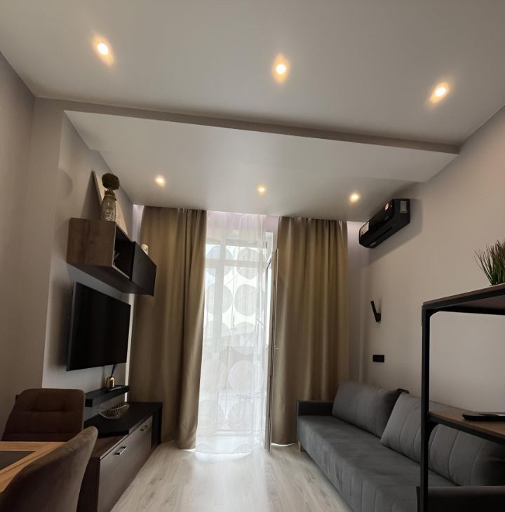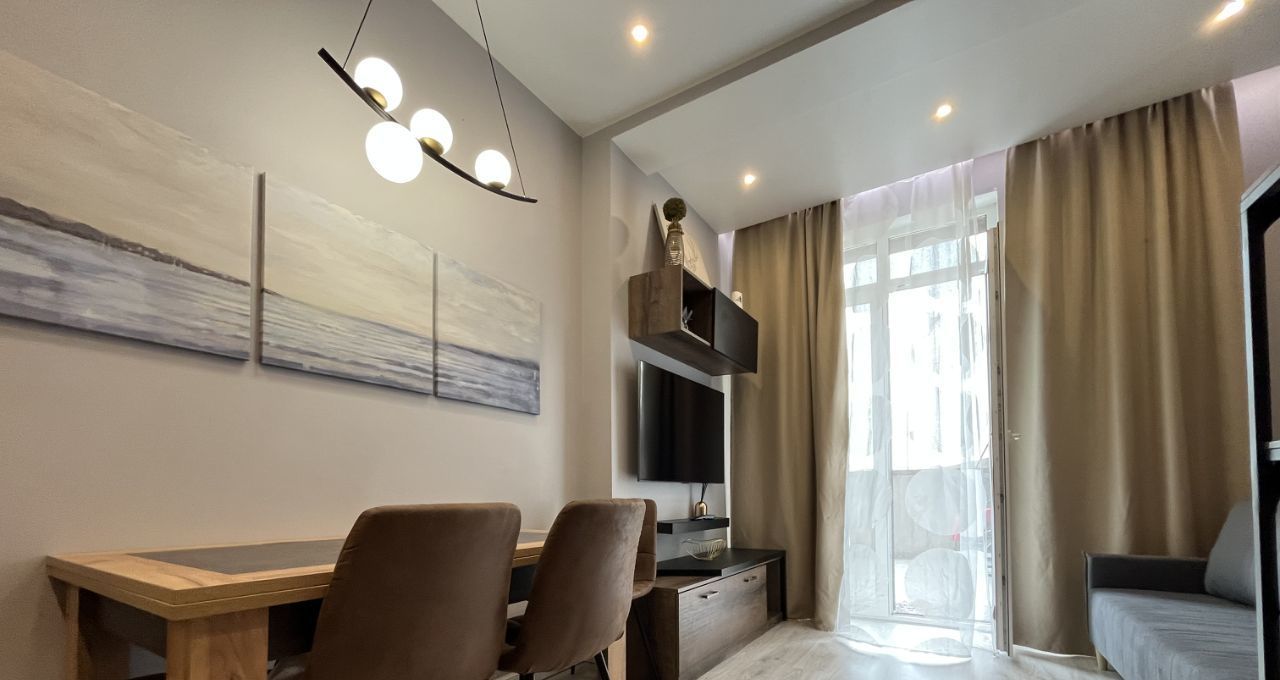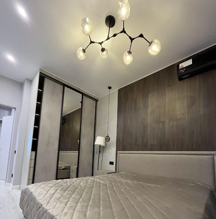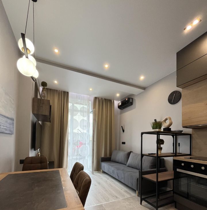 В квартире сделан дизайнерский ремонт, что придает ей особый шарм и уют. Обстановка полностью готова для комфортного проживания: есть мебель на кухне и в комнате. Из техники — кондиционер, холодильник, посудомоечная машина, телевизор и стиральная машина. Ванная комната оснащена и ванной, и душевой кабиной, поэтому можно выбрать удобный вариант. Окна выходят во двор, что обеспечивает тишину и спокойствие.