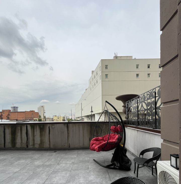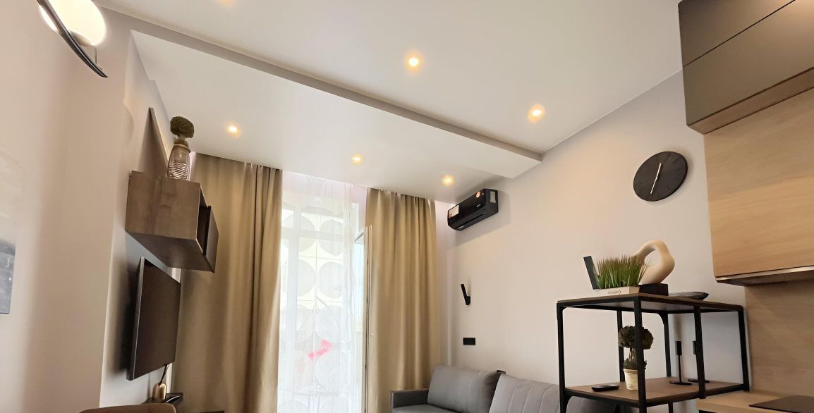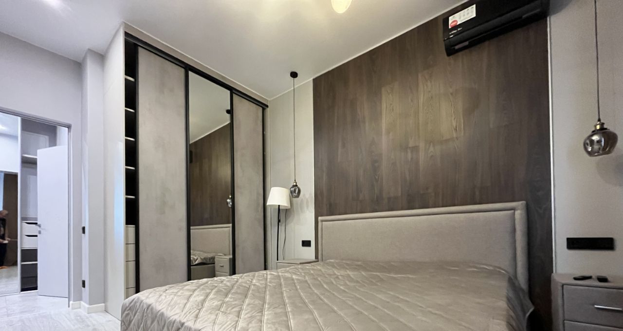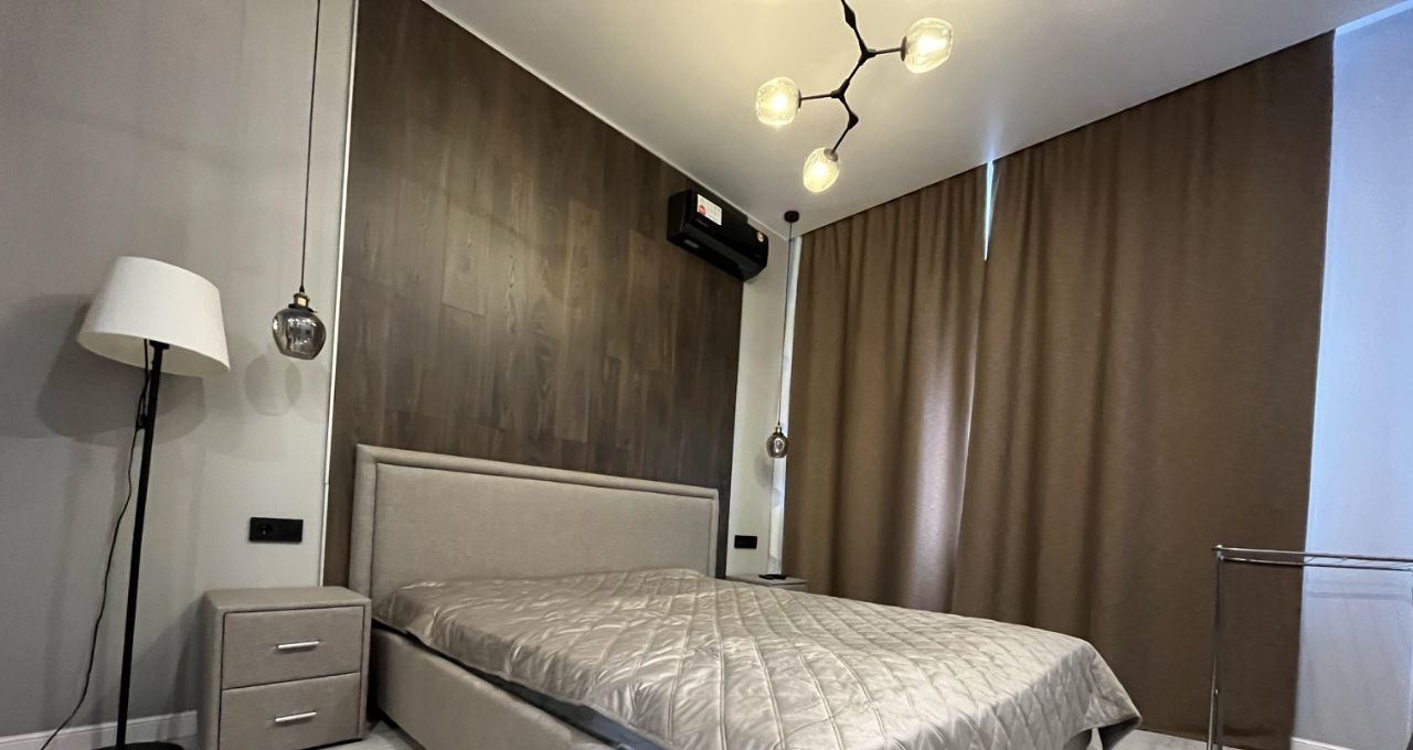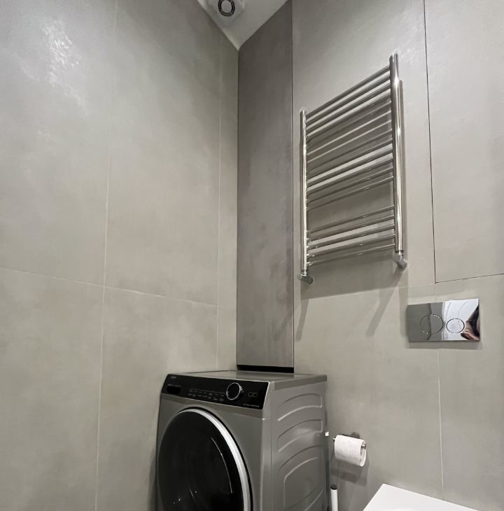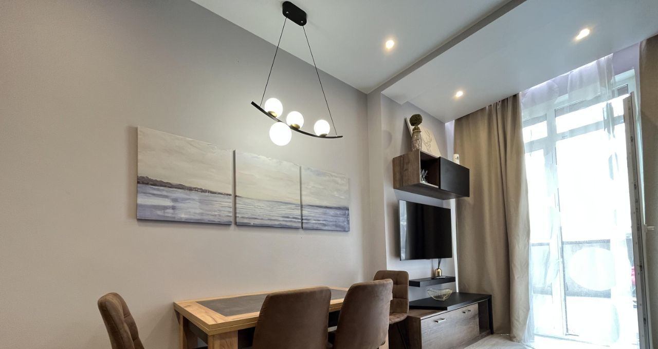 В квартире сделан дизайнерский ремонт, что придает ей особый шарм и уют. Обстановка полностью готова для комфортного проживания: есть мебель на кухне и в комнате. Из техники — кондиционер, холодильник, посудомоечная машина, телевизор и стиральная машина. Ванная комната оснащена и ванной, и душевой кабиной, поэтому можно выбрать удобный вариант. Окна выходят во двор, что обеспечивает тишину и спокойствие.