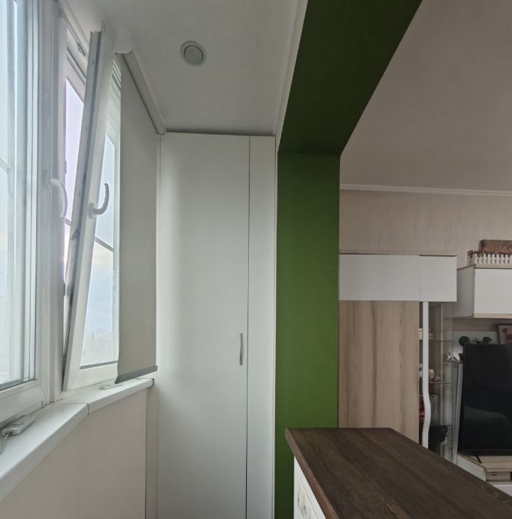 Утепленный балкон с теплым полом объединен с большой комнатной. Перепланировки нет, при желании окно и балконная дверь ставится на место.