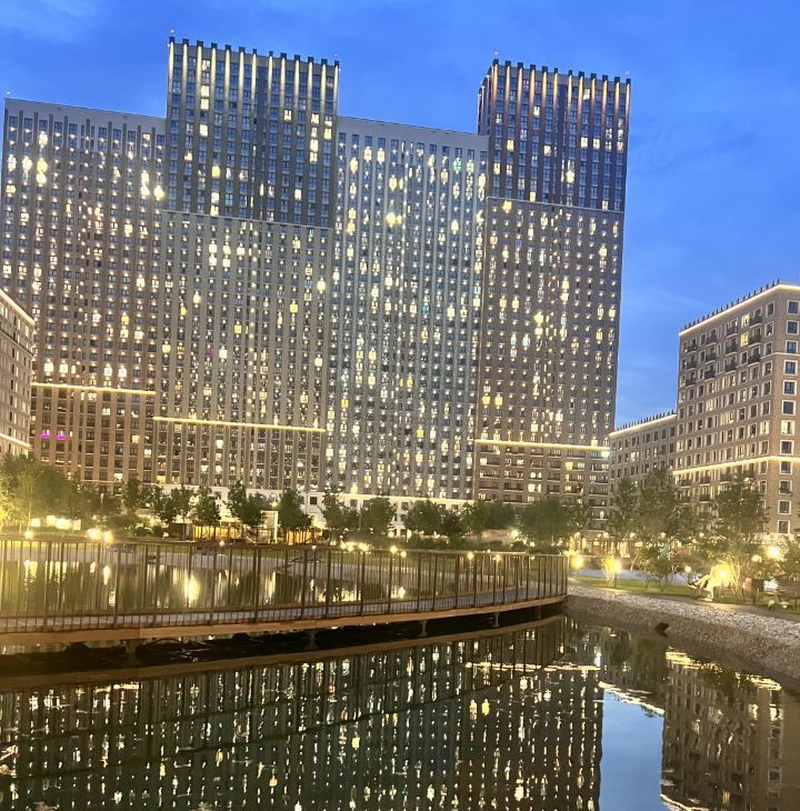 Сам Жк подсвечивается ночью, что придаёт комплексу сказочный вид. Во дворе пруд с лежаками, площадка для тенниса, футбола, площадки для занятия спортом и отдыха. Охраняемая закрытая территория, подземный паркинг(есть возможность снять машино-место). В доме с внешней стороны пекарня, OZON, Wildberries, аптека и продуктовые магазины Мираторг, кафе, ВкусВил.