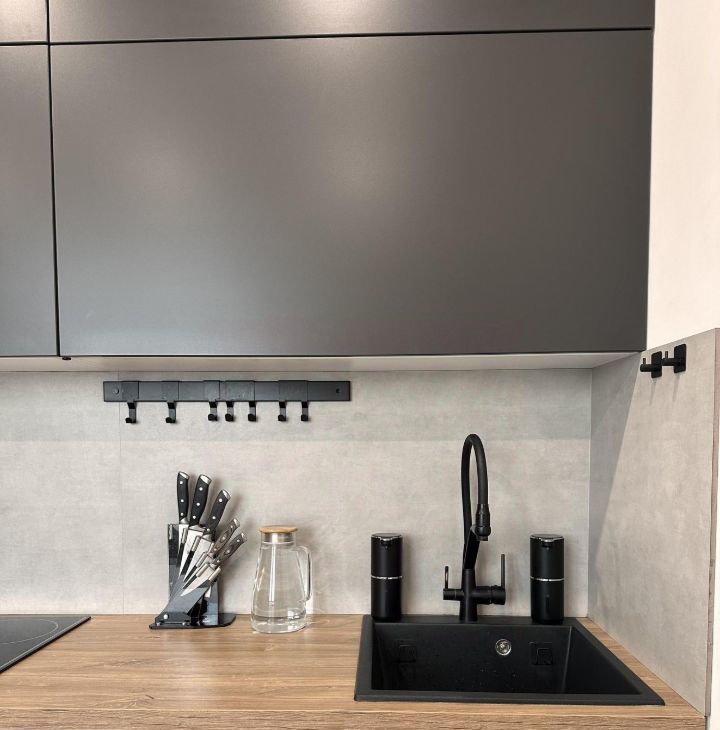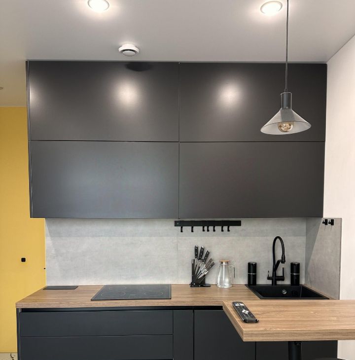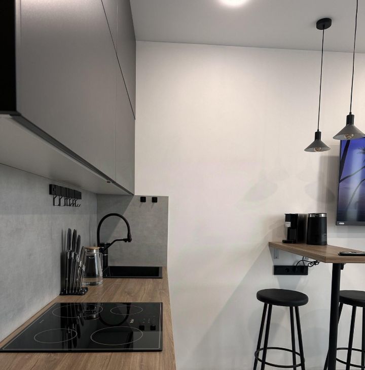 - кухня с полным кухонным гарнитуром, электрической индукционной варочной панелью, посудомоечной машиной; раковина с дополнительным водяным фильтром и измельчителем; встроенная духовка, двухсекционный холодильник.