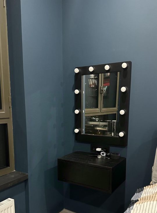 - спальня с двуспальной кроватью (металлический каркас с матрасом), зеркальным шкафом-купе, двумя столиками (туалетным и вспомогательным);