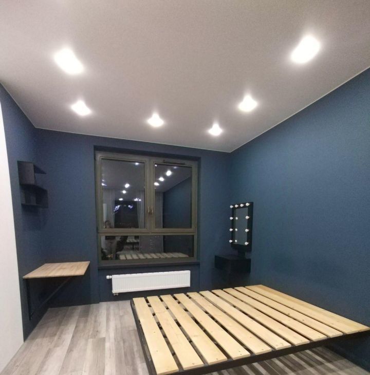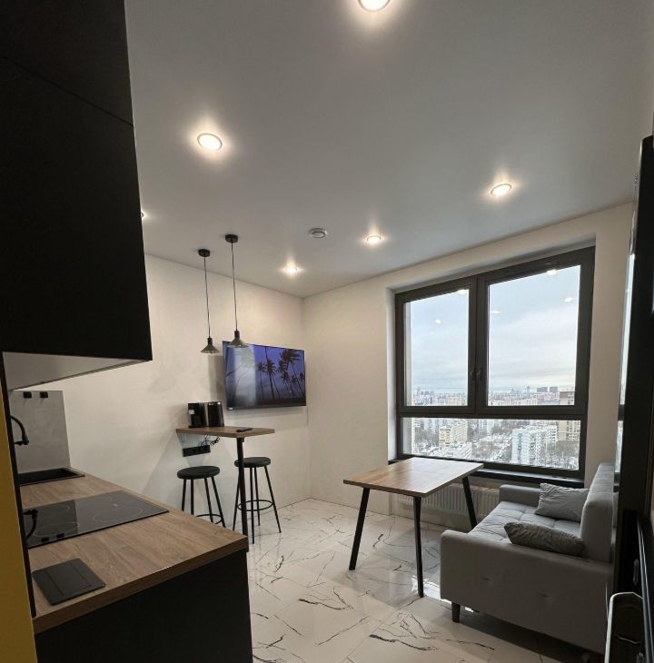 Комнаты изолированные, санузел раздельный. Полы плитка и ламинат, во всех помещениях с подогревом. Стены окрашены. Потолки натяжные. Установлен кондиционер. Окна пластиковые, увеличенные с широким панорамным видом, ориентированы на запад. Без балкона. Входная дверь металлическая.