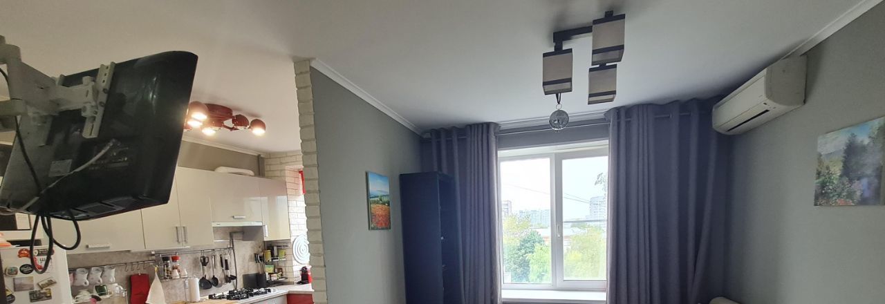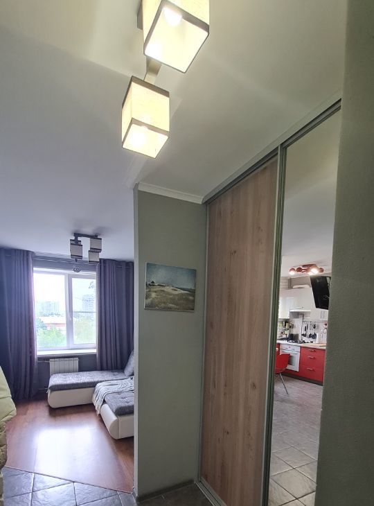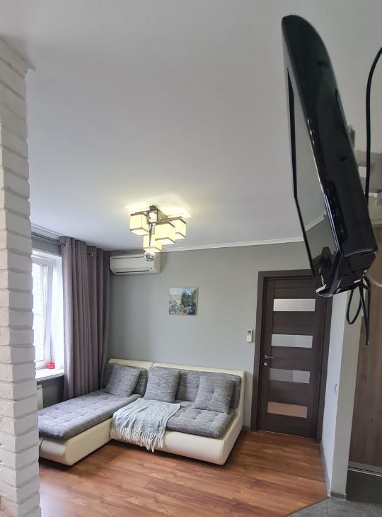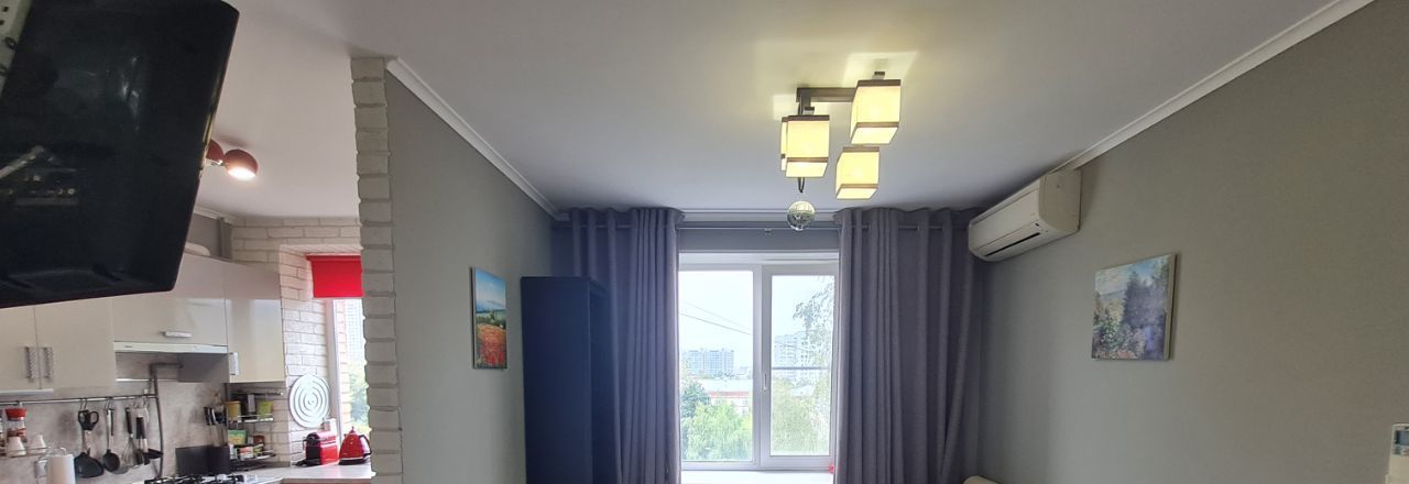 В квартире сделан евроремонт, поэтому всё выглядит современно и стильно. Есть все необходимое для комфортного проживания: кондиционер, холодильник, телевизор и стиральная машина. Мебель расположена на кухне и в комнате. Санузел совмещённый, в ванной установлена ванна. Окна выходят во двор, что делает квартиру тихой и уютной.