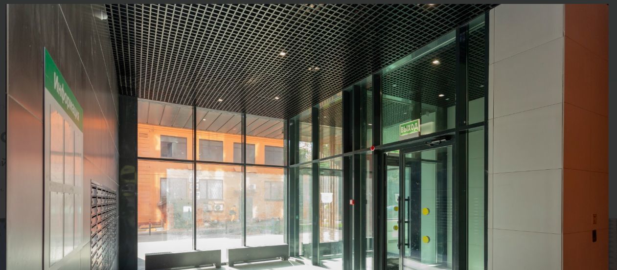 Красивый подъезд с консьержем, шлагбаум и парковка, детская площадка.