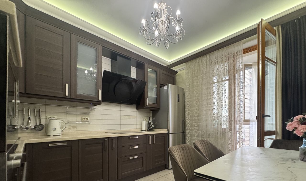 Квартира полностью готова к проживанию. Вся техника :холодильник , посудомоечная машина, микроволновая печь, вытяжка. В каждой комнате - кондиционер и телевизор. Мебель Италия, массив дерева. Панорамные окна в пол. 2 отдельных санузла: основной с ванной, гостевой - с душем. Бойлер. Лоджия с панорамным остеклением, мебелью, прекрасным видом и атмосферой спокойного отдыха.