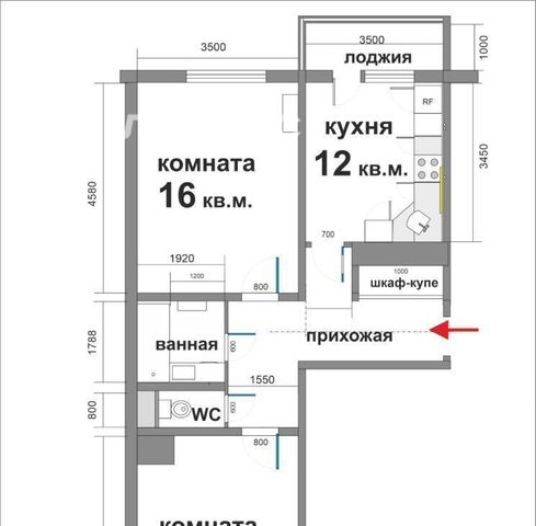 Общая S 58 кв.м. Кухня 12 кв.м., изолированные комнаты по 16 кв.м. каждая.