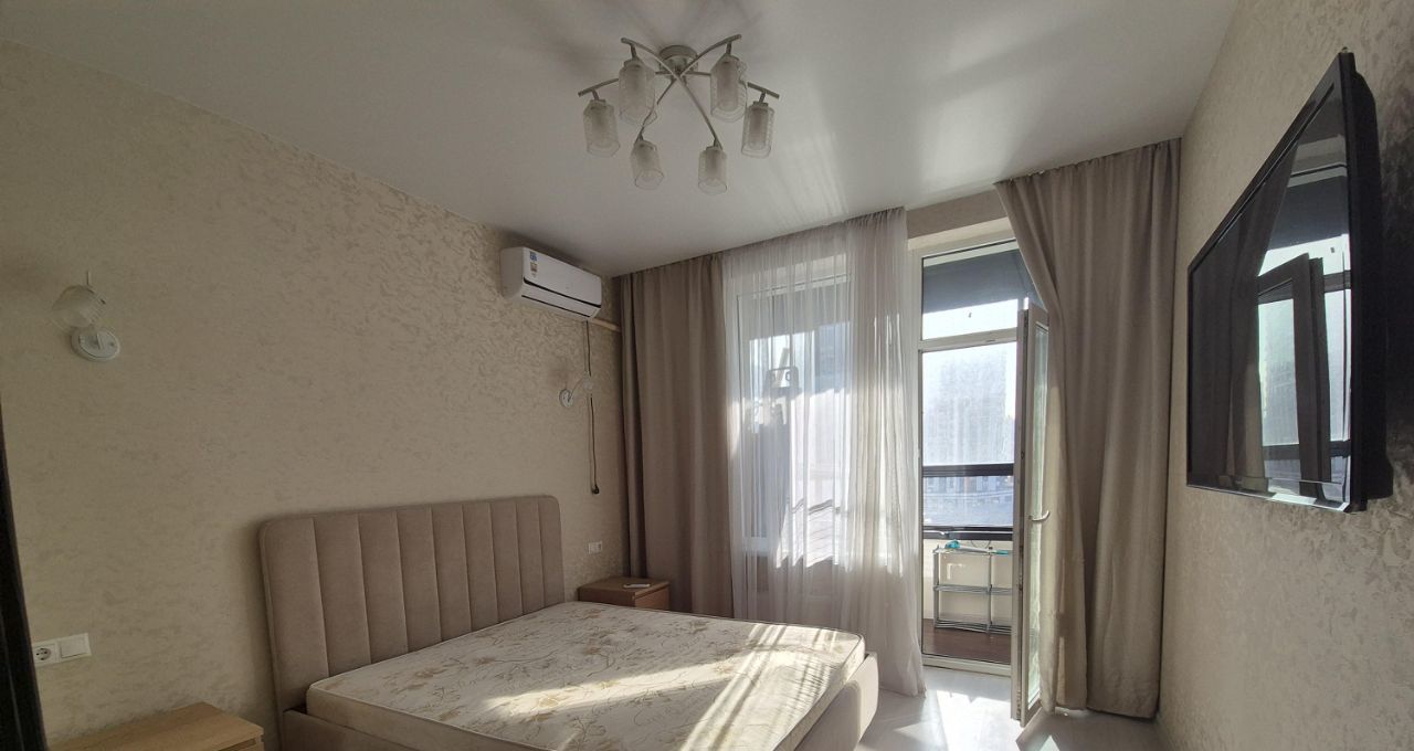 -Спальня : Двуспальная кровать (15 кв.м) , прикроватные тумбы, встроенный шкаф-купе, кондиционер, настенный телевизор.