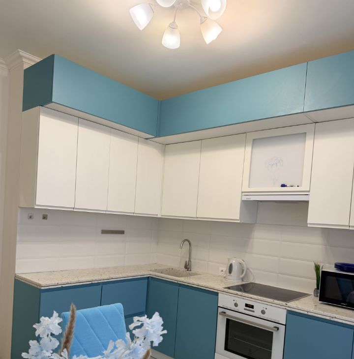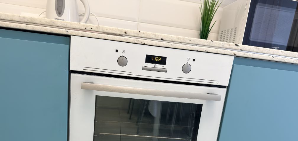 Встроенная кухня оборудована всей необходимой бытовой техникой. Столешница гранит, варочная панель, духовой шкаф, посудомоечная машина