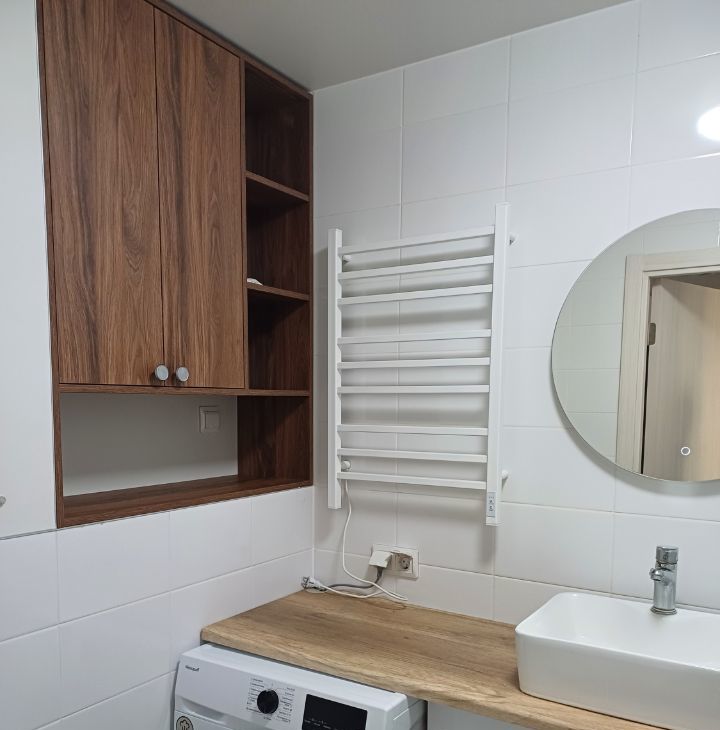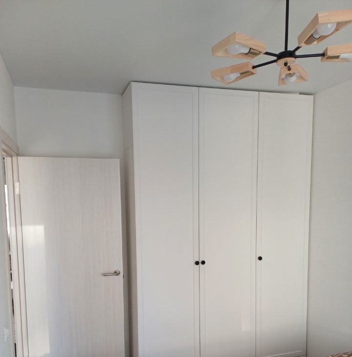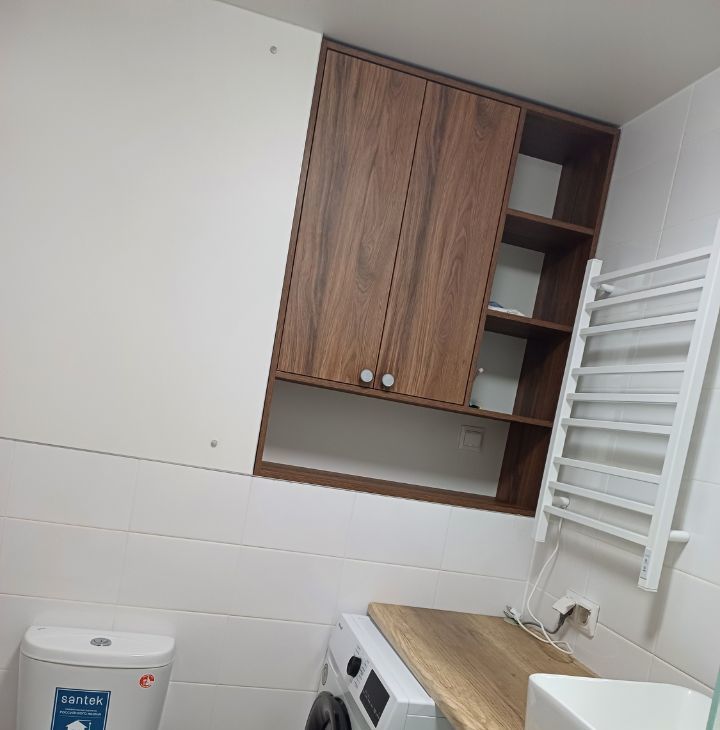 В комнате вместительный шкаф (выполнен на заказ), кровать (с подъемным механизмом и местом для хранения), а также маленький откидной столик.