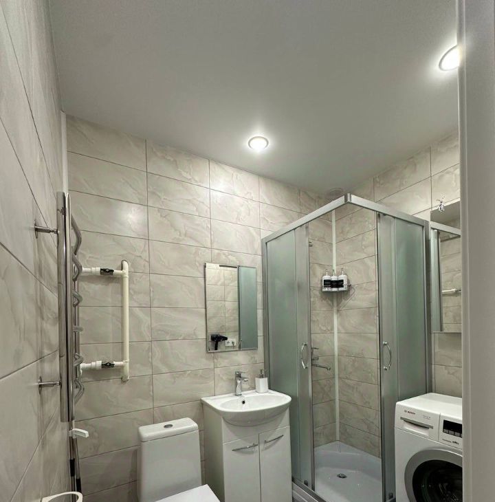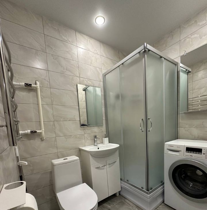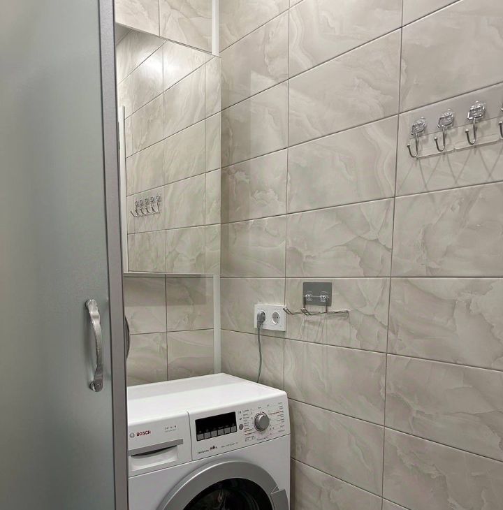 Вся необходимая мебель в комнатах, на кухне и санузле. В большой спальне кондиционер и телевизор. В ванной комнате зеркальный шкаф над стиральной машиной, душевая кабина, раковина с тумбой и зеркалом, унитаз - всё новое. На кухне новые электрический чайник, микроволновка, встроенная посудомоечная машина, отдельностоящая газовая плита с духовкой, холодильник.