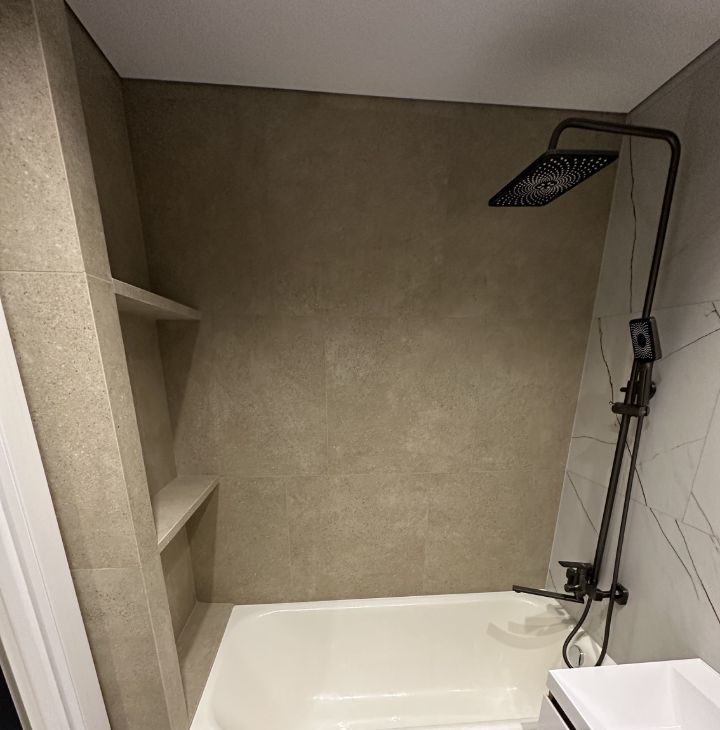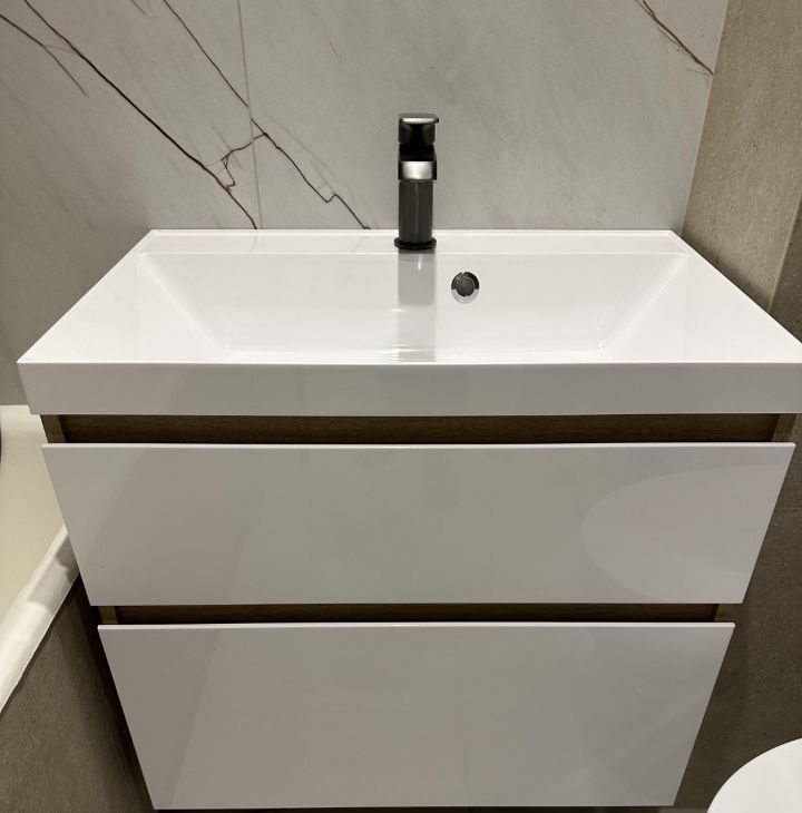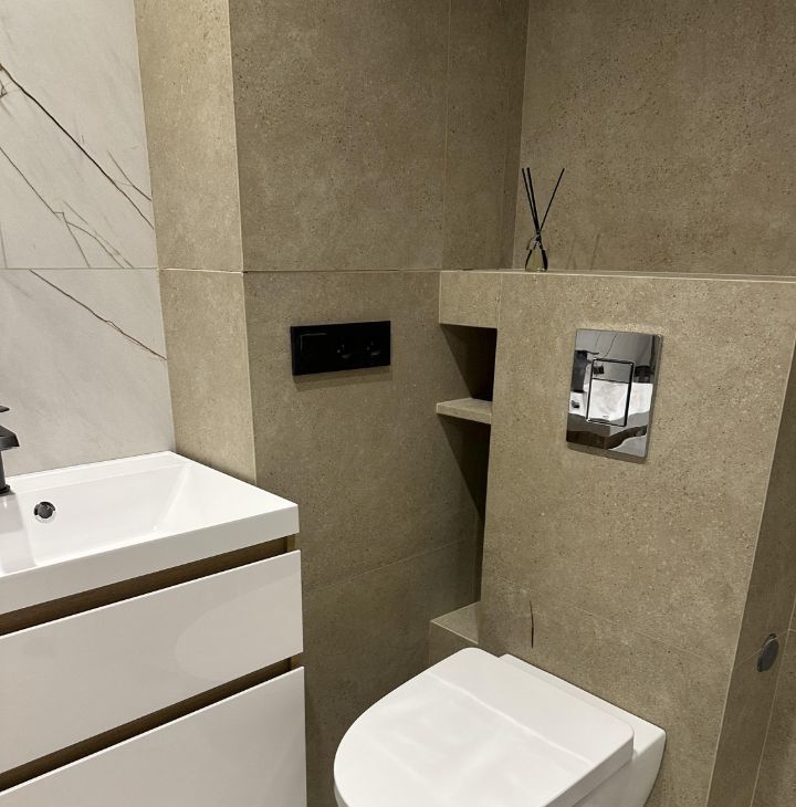 Санузел полностью оборудован: установлена новая сантехника — ванна с душевой системой, подвесной унитаз с инсталляцией, раковина с тумбой и зеркалом;