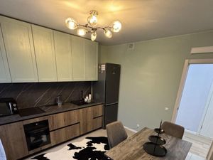 Полностью оборудованная кухня: посудомоечная машина, духовой шкаф, электрическая варочная панель (2 конфорки), холодильник и стильная мебель.