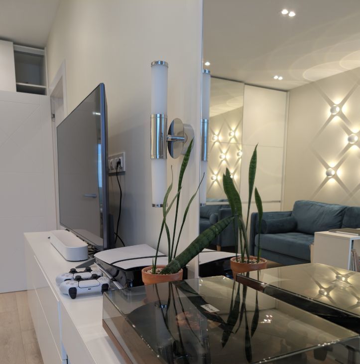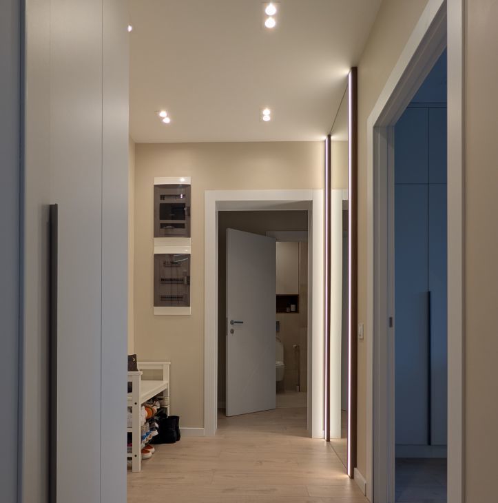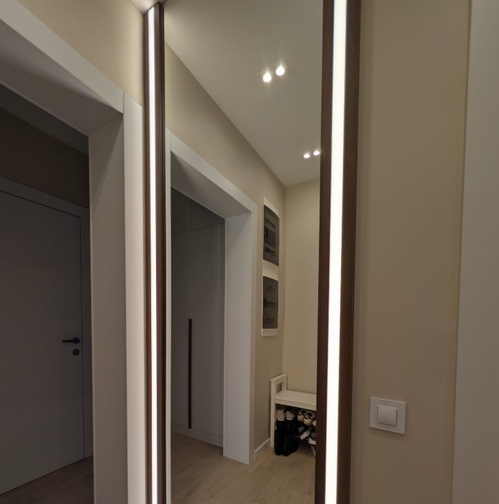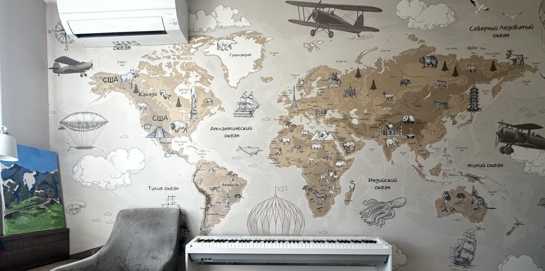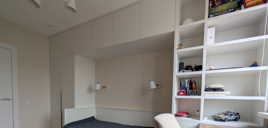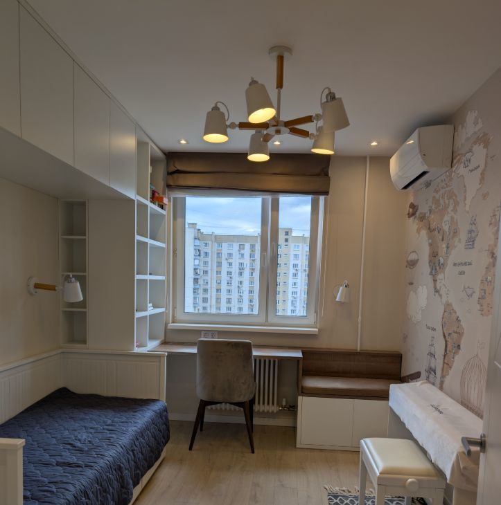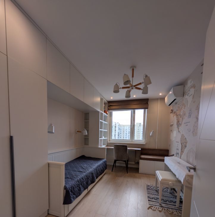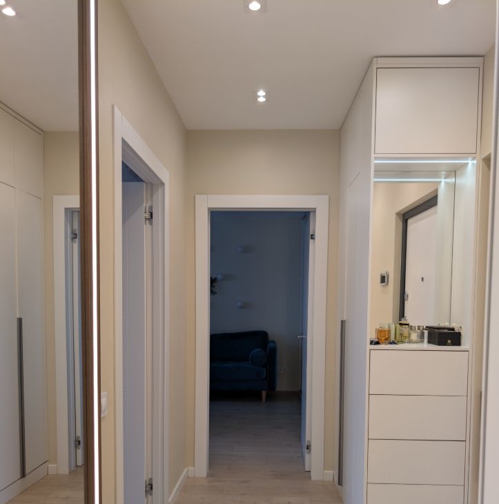 Потолки из ГКЛ, стены под покраску + фреска в детской комнате единым листом с изображением карты мира, на полу ламинат в комнатах и керамогранит в зоне санузла и кухни, входная дверь Torex, видеодомофон, межкомнатные двери из эмалированной мдф Волховец, итальянские радиаторы отопления, две сплит-системы, разные сценарии освещения, разводка интернет-кабеля Ethernet в двух комнатах, проведен оптоволоконный кабель МТС в слаботочный щит.