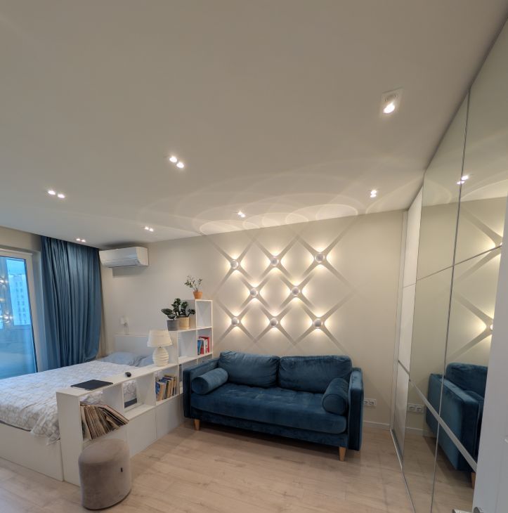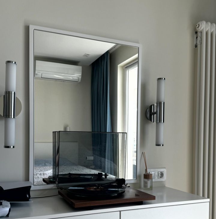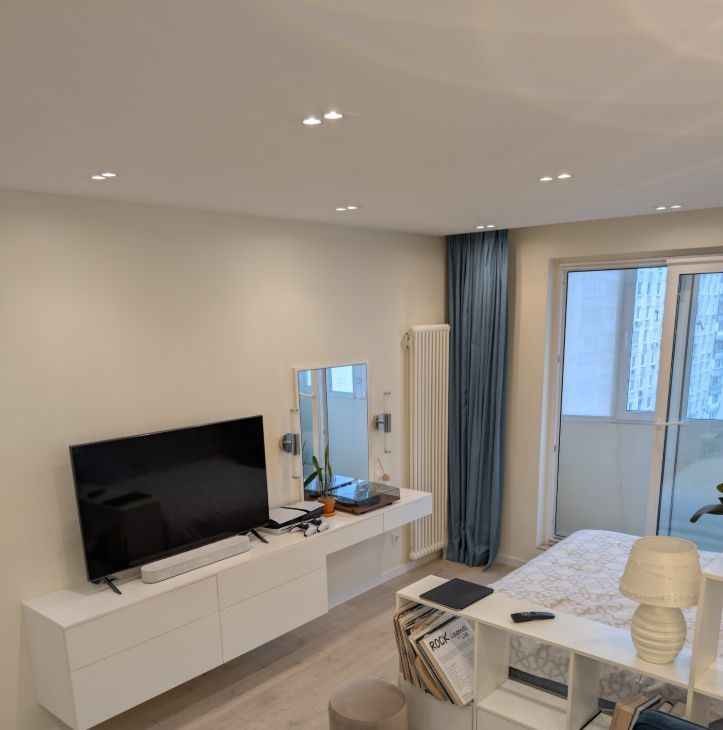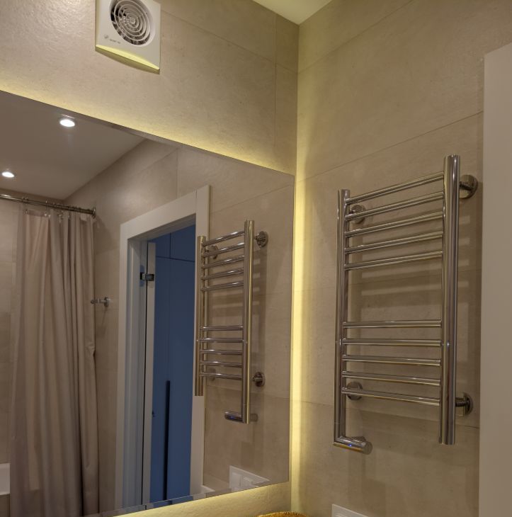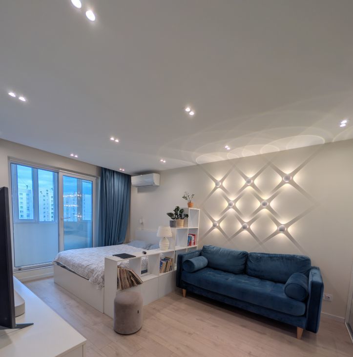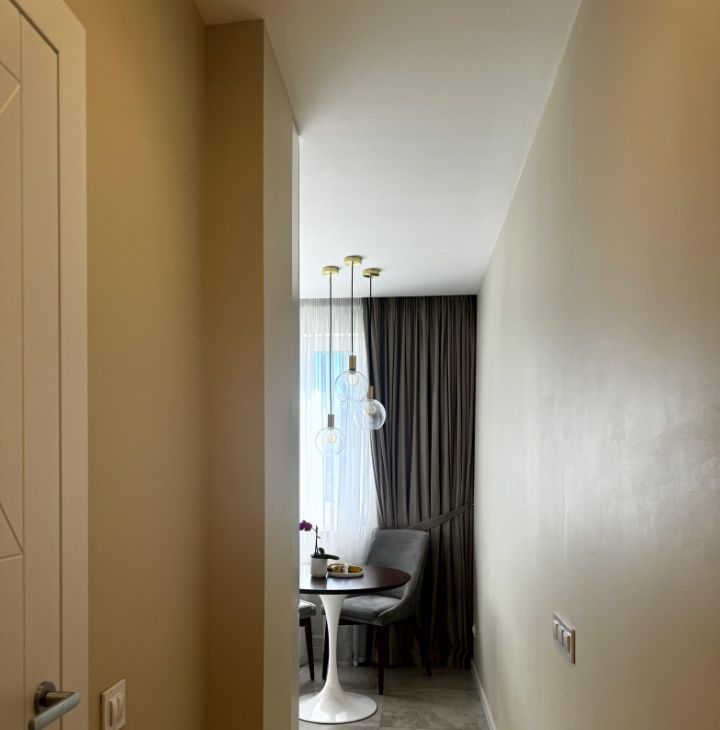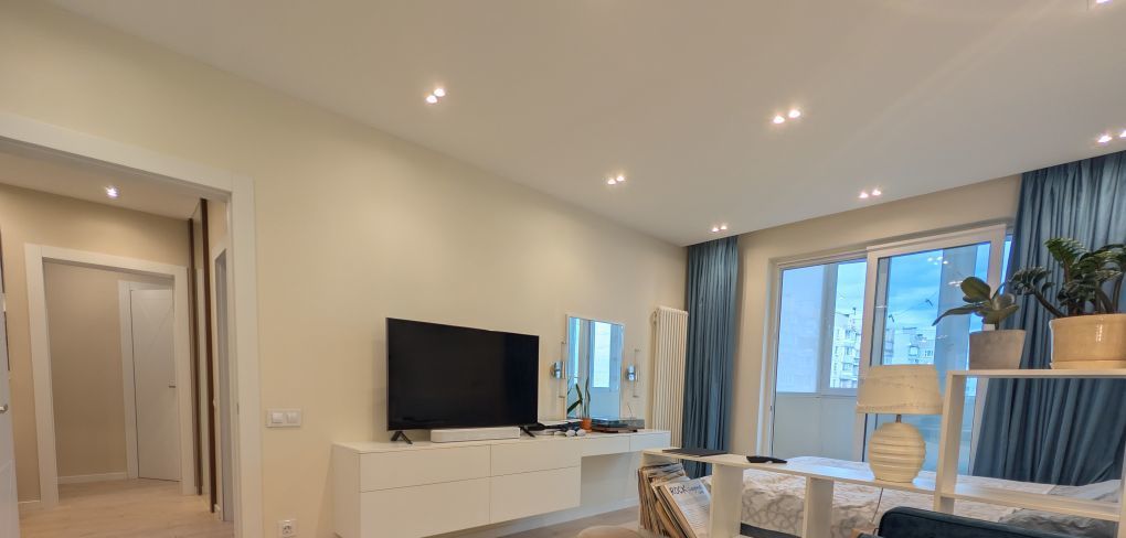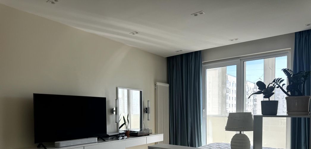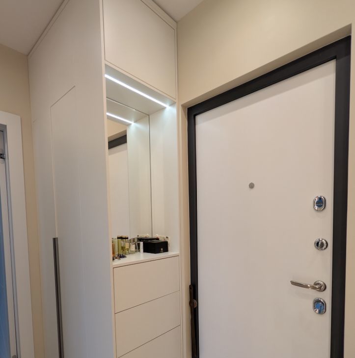 Потолки из ГКЛ, стены под покраску + фреска в детской комнате единым листом с изображением карты мира, на полу ламинат в комнатах и керамогранит в зоне санузла и кухни, входная дверь Torex, видеодомофон, межкомнатные двери из эмалированной мдф Волховец, итальянские радиаторы отопления, две сплит-системы, разные сценарии освещения, разводка интернет-кабеля Ethernet в двух комнатах, проведен оптоволоконный кабель МТС в слаботочный щит.