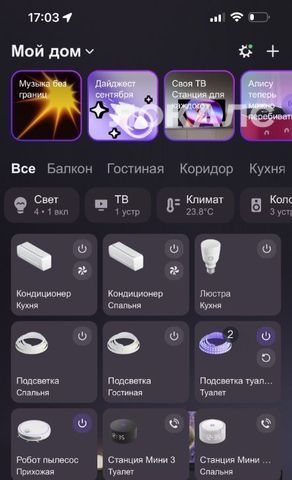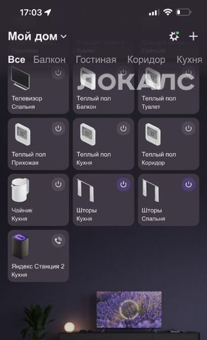 В квартире есть система Умный дом с Алисой. Три Яндекс Станции позволяют голосом управлять освещением, шторами, кондиционерами, теплыми полами и другими элементами квартиры. Управление со смартфона дает возможность охладить квартиру летом или обогреть зимой перед возвращением из поездки. Настройка сценариев позволяет, например, автоматически открывать шторы по будильнику или закрывать их с восходом солнца.