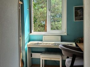Окна на южную сторону, в старый яблоневый сад-сквер - 3 гектара в приятной тени деревьев. Под окнами сосна, сирень, вишня, слива, черемуха, клен.