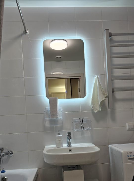 В ванной зеркало с подсветкой, удобные полки, новая шторка, стиральная машина, вместительный шкафчик для хранения.