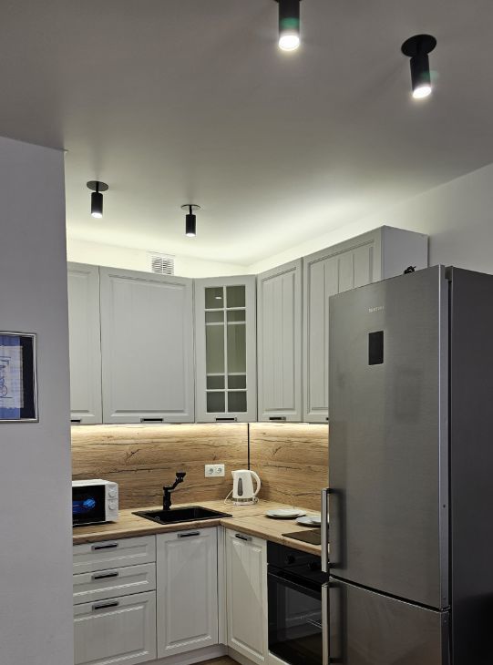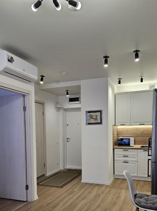 В квартире оборудована хорошая кухня со всей качественной техникой: варочная панель, духовой шкаф (большой), посудомоечная машина, скрытая вытяжка с угольным фильтром, 2-х метровый холодильник, микроволновая печь, чайник. Вся техника новая, холодильник и чайник в идеальном состоянии. Также в кухонной зоне подсветка регулируется по степени интенсивности, верхний свет можно включать зонами. Много розеток.