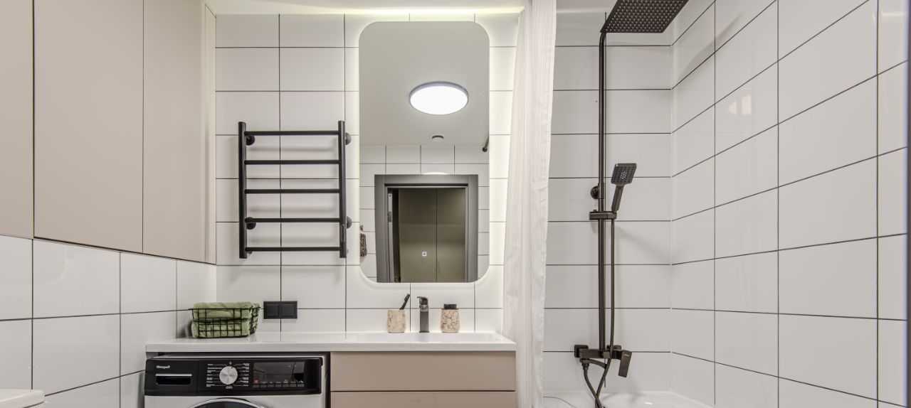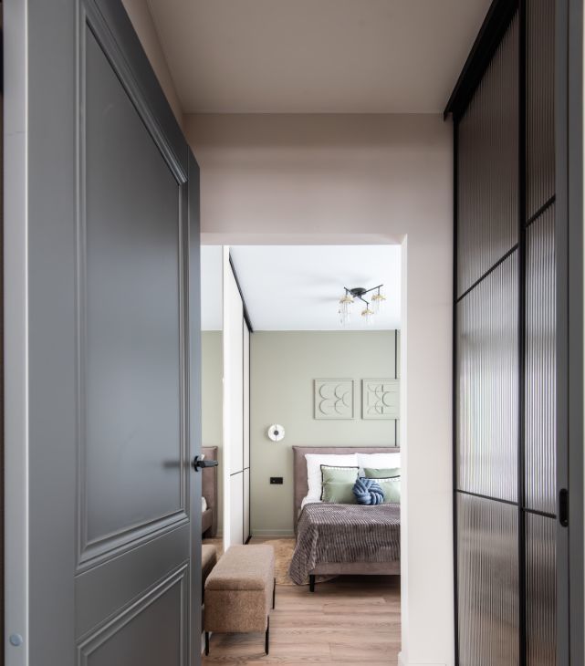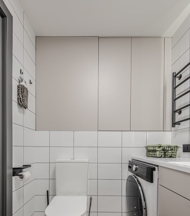 Установлена стиральная машинка с функцией сушки. Много мест хранения: большой шкаф в коридоре, вместительная гардеробная, большой шкаф-купе в спальне.