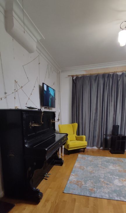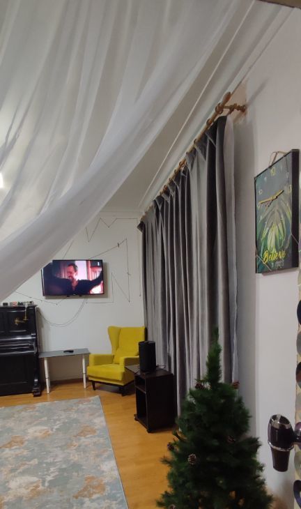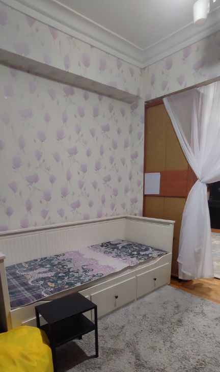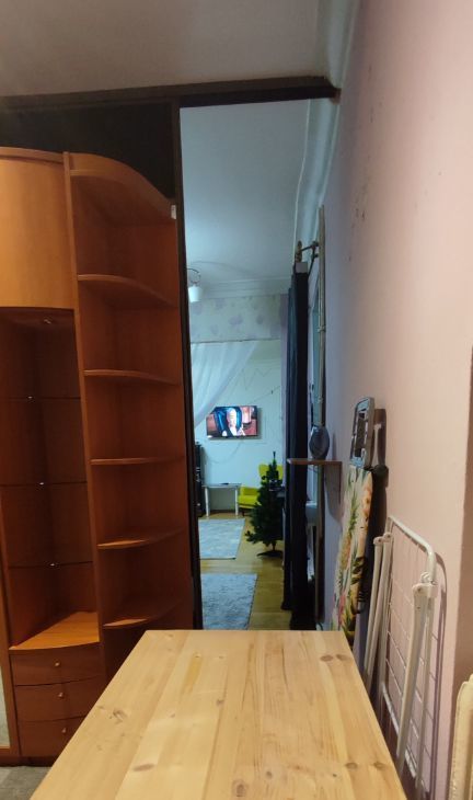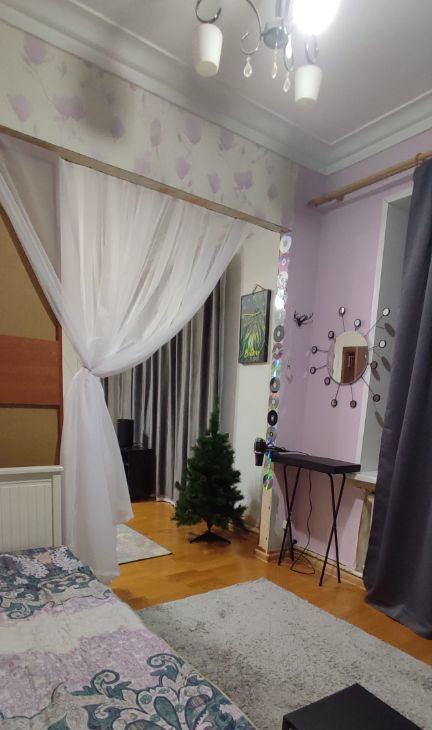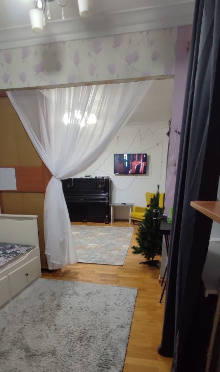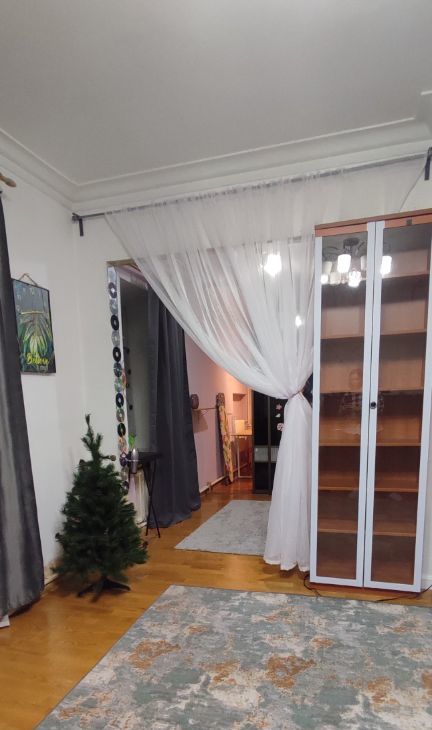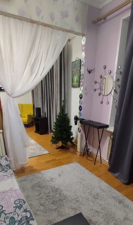 ВНИМАНИЕ! Это одна комната из которой вытекает другая поменьше, а из неё ещё одна маленькая. На фото показано, что есть перегородка в виде занавески и стеклянных дверей купе. Стен и дверей между ними нет.
