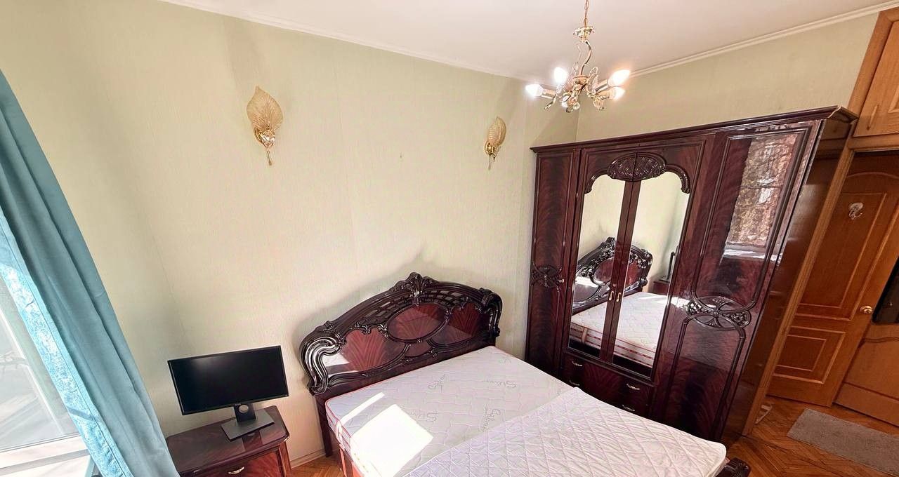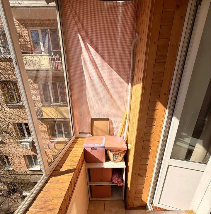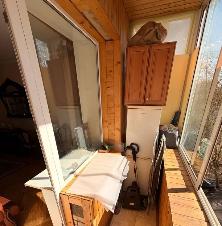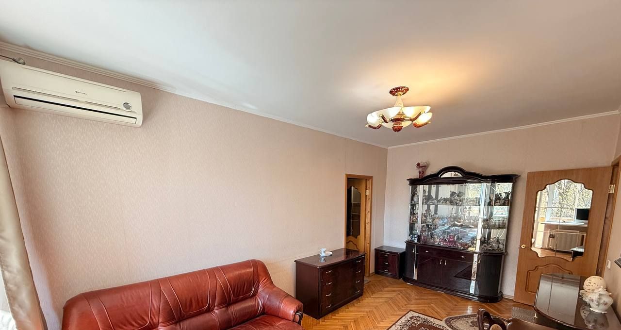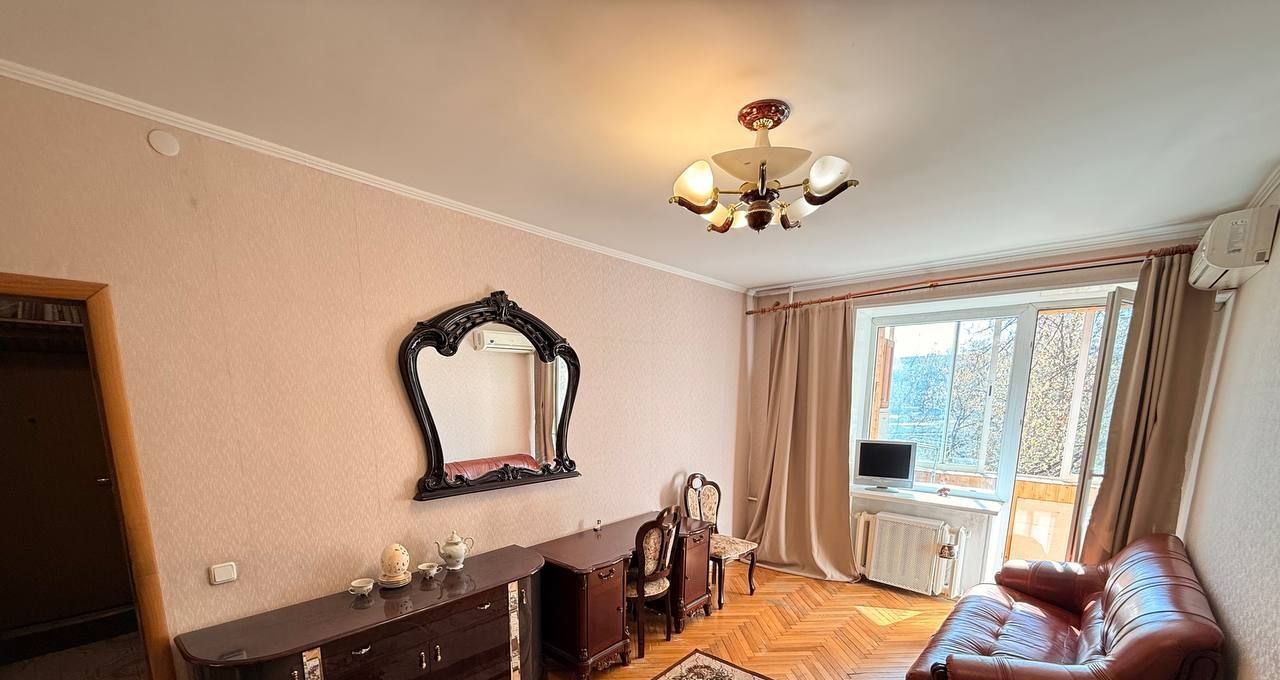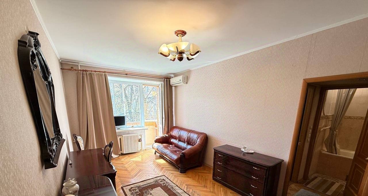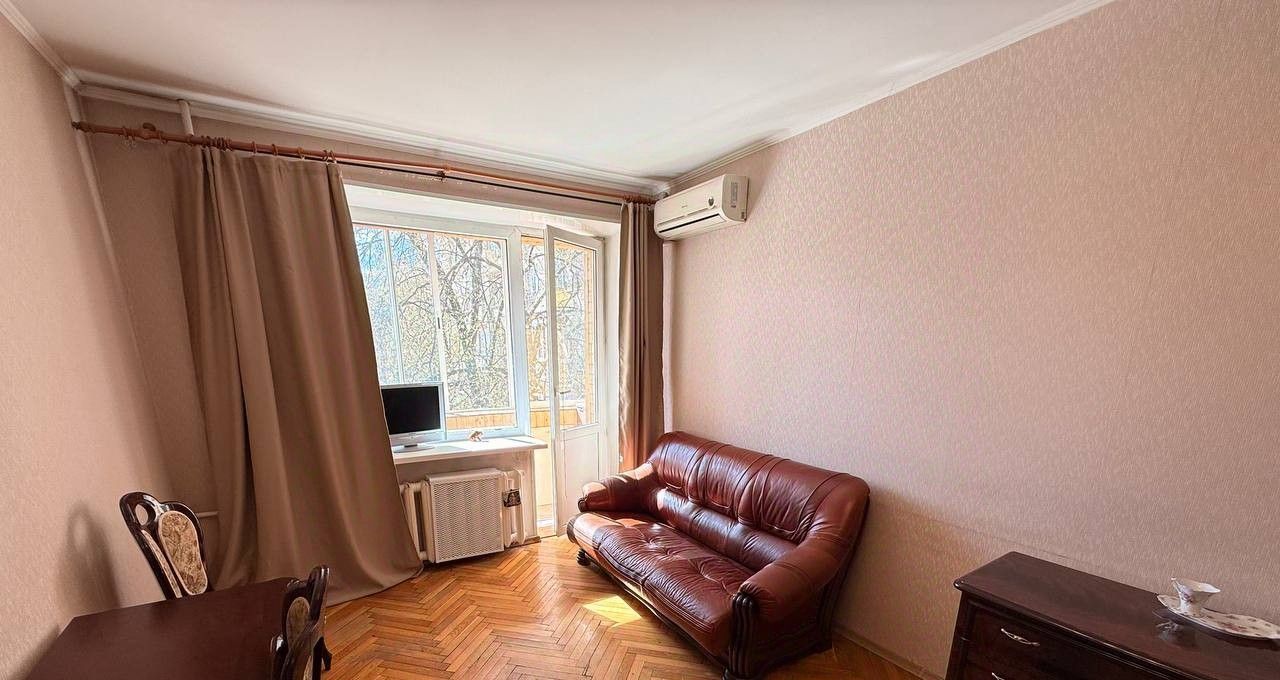 Гостиная: Итальянский кожаный раскладной диван, рабочий стол. Кондиционер. Из гостиной выход на застекленный балкон. Окна выходят в тихий двор.
