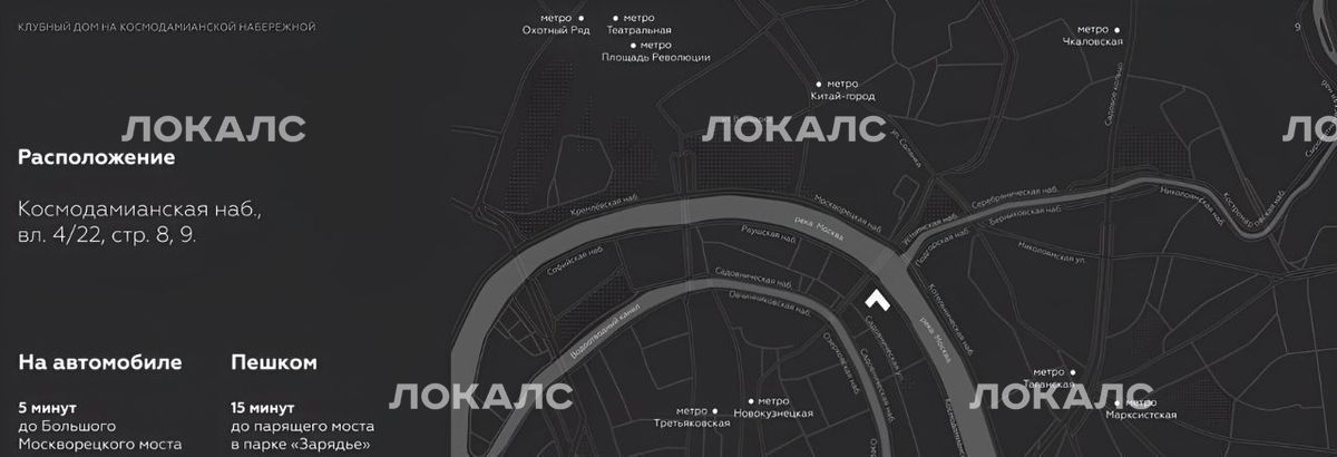 Дом расположен в центре исторического острова Балчуг, при этом Космодамианская набережная не загружена трафиком, ощущение спокойного и неспешного движения и жизни. Исторически вдоль острова Балчуг располагались государевы сады.